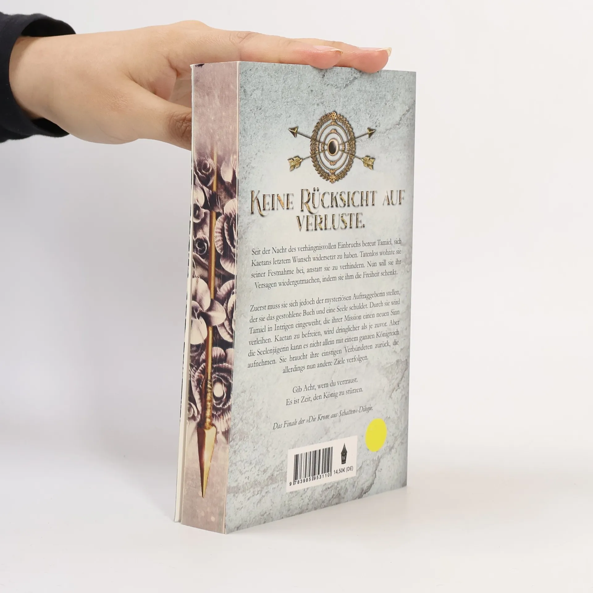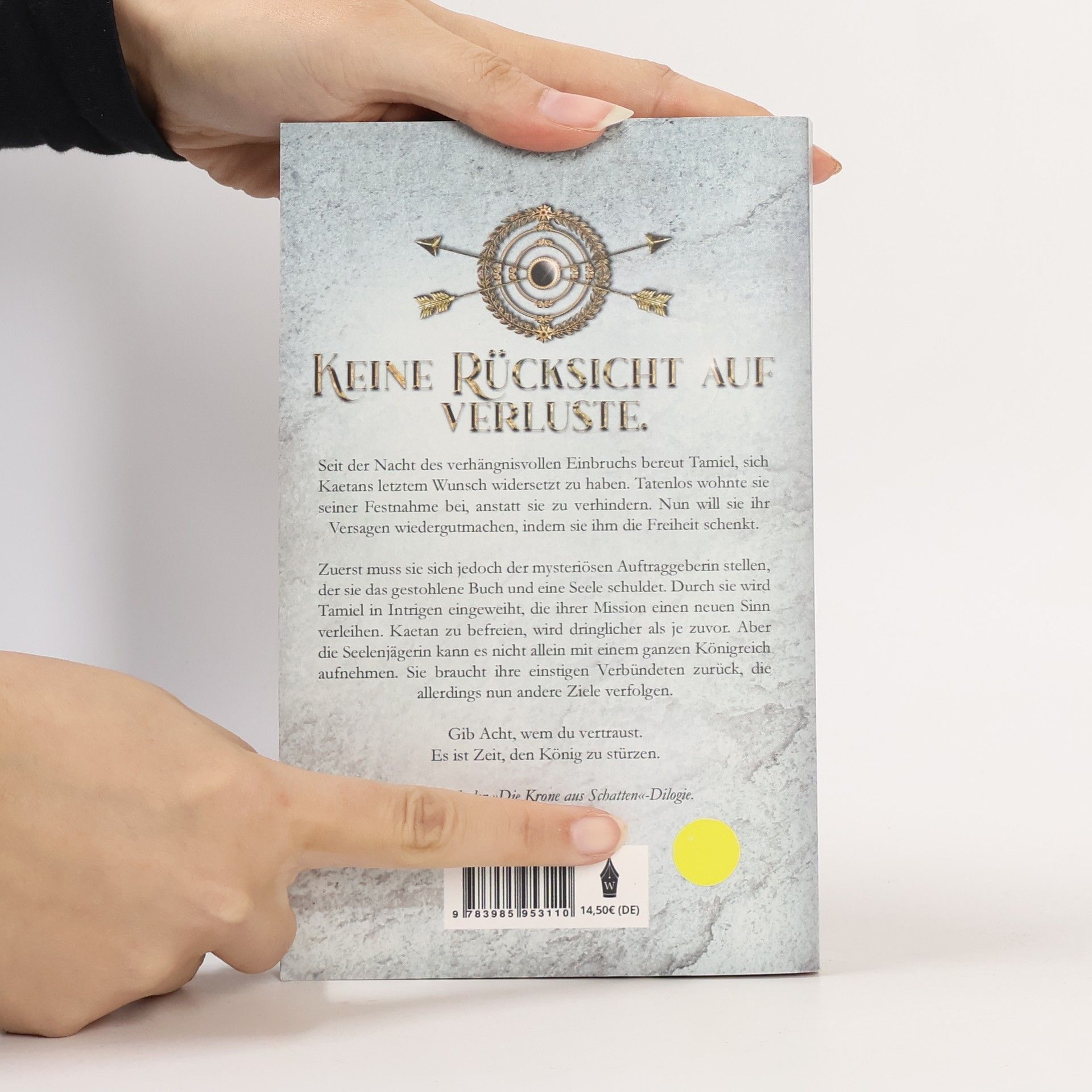 »Keine Rücksicht auf Verluste.« Seit der Nacht des verhängnisvollen Einbruchs bereut Tamiel, sich Kaetans letztem Wunsch widersetzt zu haben. Tatenlos wohnte sie seiner Festnahme bei, anstatt sie zu verhindern. Nun will sie ihr Versagen wiedergutmachen, indem sie ihm die Freiheit schenkt. Zuerst muss sie sich jedoch der mysteriösen Auftraggeberin stellen, der sie das gestohlene Buch und eine Seele schuldet. Durch sie wird Tamiel in Intrigen eingeweiht, die ihrer Mission einen neuen Sinn verleihen. Kaetan zu befreien, wird dringlicher als je zuvor. Aber die Seelenjägerin kann es nicht allein mit einem ganzen Königreich aufnehmen. Sie braucht ihre einstigen Verbündeten zurück, die allerdings nun andere Ziele verfolgen. Gib Acht, wem du vertraust. Es ist Zeit, den König zu stürzen. Das Finale der »Die Krone aus Schatten«-Dilogie.