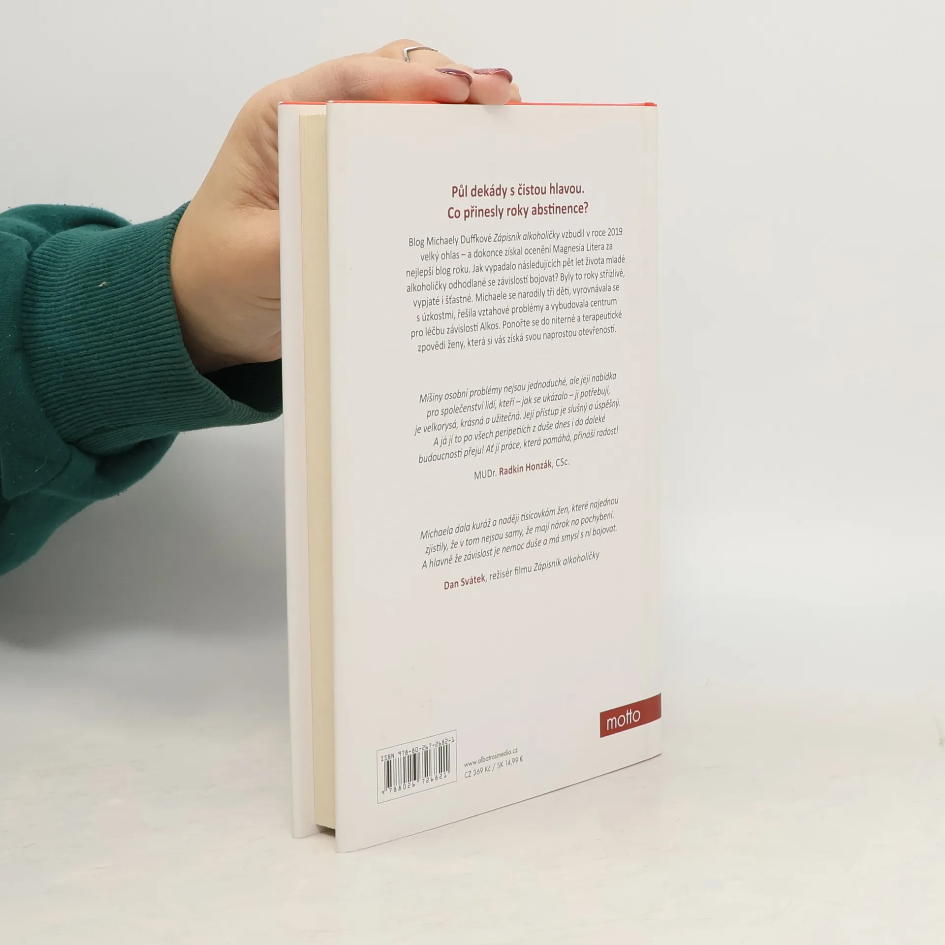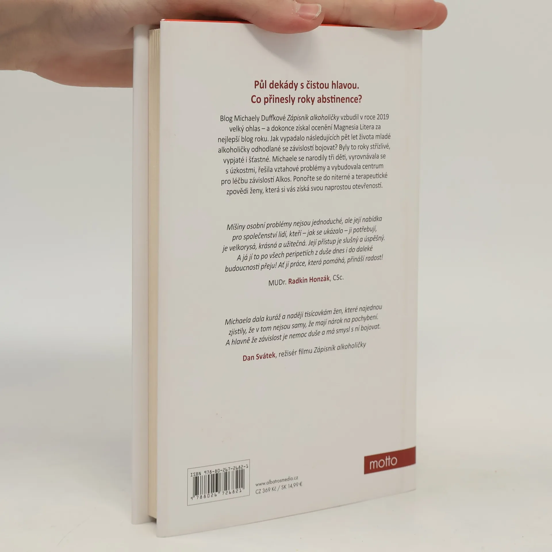 Mladá autorka si získala pozornost svým blogem, kde otevřeně popisovala svůj boj s démonem alkoholu. Pět let už je na suchu, ale nebylo to rozhodně jednoduché. Blog Michaely Duffkové Zápisník alkoholičky vzbudil v roce 2019 velký ohlas - a dokonce získal ocenění Magnesia Litera za nejlepší blog roku. Jak vypadalo následujících pět let života mladé alkoholičky odhodlané se závislostí bojovat? Byly to roky střízlivé, vypjaté i šťastné. Michaele se narodily tři děti, vyrovnávala se s úzkostmi, řešila vztahové problémy a vybudovala centrum pro léčbu závislostí Alkos. Ponořte se do niterné a terapeutické zpovědi ženy, která si vás získá svou naprostou otevřeností. Nakladatelská anotace.