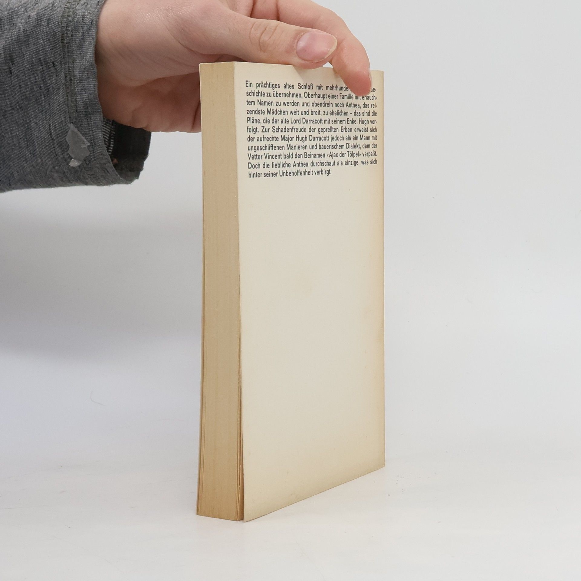 Ein prächtiges altes Schloß mit mehrhundertjähriger Geschichte zu übernehmen, Oberhaupt einer Familie mit erlauchtem Namen zu werden und obendrein noch Anthea, das reizendste Mädchen weit und breit, zu ehelichen - das sind Pläne, die der alte Lord Darracott mit seinem Enkel Hugh verfolgt. Zur Schadenfreude der geprellten Erben erweist sich der aufrechte Major Hugh Darracott jedoch als ein Mann mit ungeschliffenen Manieren und bäuerischem Dialekt, dem der Vetter Vincent bald den Beinamen "Ajax der Tölpel" verpaßt. Doch die liebliche Anthea durchschaut als einzige, was sich hinter seiner Unbeholfenheit verbirgt.