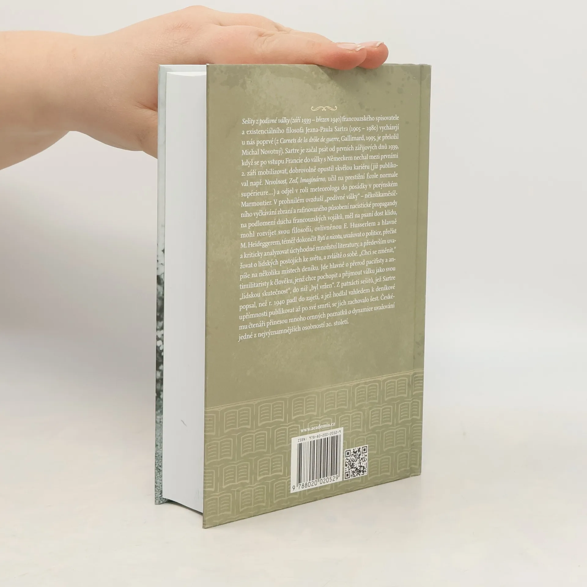 Sešity z podivné války (září 1939–březen 1940) francouzského spisovatele a existenciálního filosofa Jeana-Paula Sartra (1905–1980) vycházejí u nás poprvé. Sartre je začal psát od prvních zářijových dnů 1939, když se po vstupu Francie do války s Německem nechal mezi prvními 2. září mobilizovat, dobrovolně opustil skvělou kariéru (již publikoval např. Nevolnost, Zeď, Imaginárno, učil na prestižní École normale supérieure) a odjel v roli meteorologa do posádky v porýnském Marmoutier. V prohnilém ovzduší „podivné války“ – několikaměsíčního vyčkávání zbraní a rafinovaného působení nacistické propagandy na podlomení ducha francouzských vojáků, měl na psaní dost klidu, mohl rozvíjet svou filosofii, ovlivněnou E. Husserlem a hlavně M. Heideggerem, téměř dokončit Bytí a nicotu, uvažovat o politice, přečíst a kriticky analyzovat úctyhodné množství literatury, a především uvažovat o lidských postojích ke světu, a zvláště o sobě. „Chci se změnit,“ píše na několika místech deníku. Jde hlavně o přerod pacifisty a antimilitaristy k člověku, jenž chce pochopit a přijmout válku jako svou „lidskou skutečnost“, do níž „byl vržen“. Z patnácti sešitů, jež Sartre popsal, než r. 1940 padl do zajetí, a jež hodlal vzhledem k deníkové upřímnosti publikovat až po své smrti, se jich zachovalo šest. Českému čtenáři přinesou mnoho cenných poznatků o dynamice uvažování jedné z nejvýznamnějších osobností 20. století.