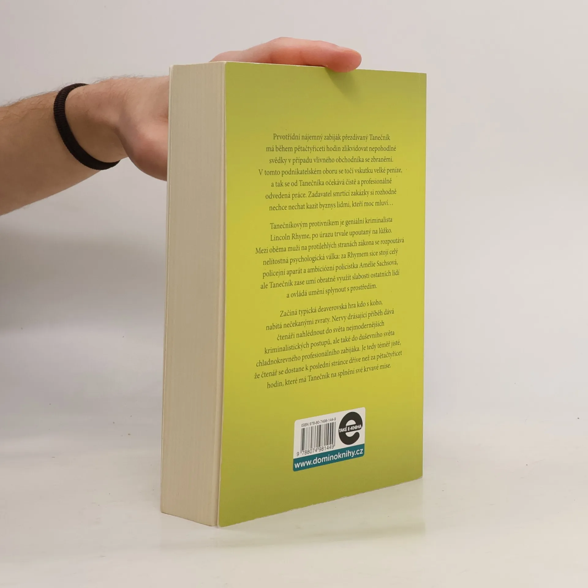 Geniální kriminalista Lincoln Rhyme a mladá policistka Amélie Sachsová, kteří se čtenářům poprvé představili v bestselleru Sběratel kostí, řeší další zapeklitý případ: během pětačtyřiceti hodin musejí vypátrat profesionálního vraha, přezdívaného Tanečník. Tanečník má v této lhůtě zlikvidovat tři nepohodlné svědky v případu vlivného obchodníka se zbraněmi a již od prvního okamžiku nenechává nikoho na pochybách, že si důvtipem a inteligencí nezadá s Rhymem. Mezi oběma muži se na dálku rozpoutá nelítostná psychologická válka, plná zvratů a úskoků, která se neobejde bez těžkých ztrát na životech. Nervy drásající příběh dává nahlédnout do zákulisí americké policejní praxe a zároveň je brilantní sondou do duševního světa chladnokrevného zabijáka. V publikaci uvedeno chybně vydání třetí, správně je: vydání čtvrté
