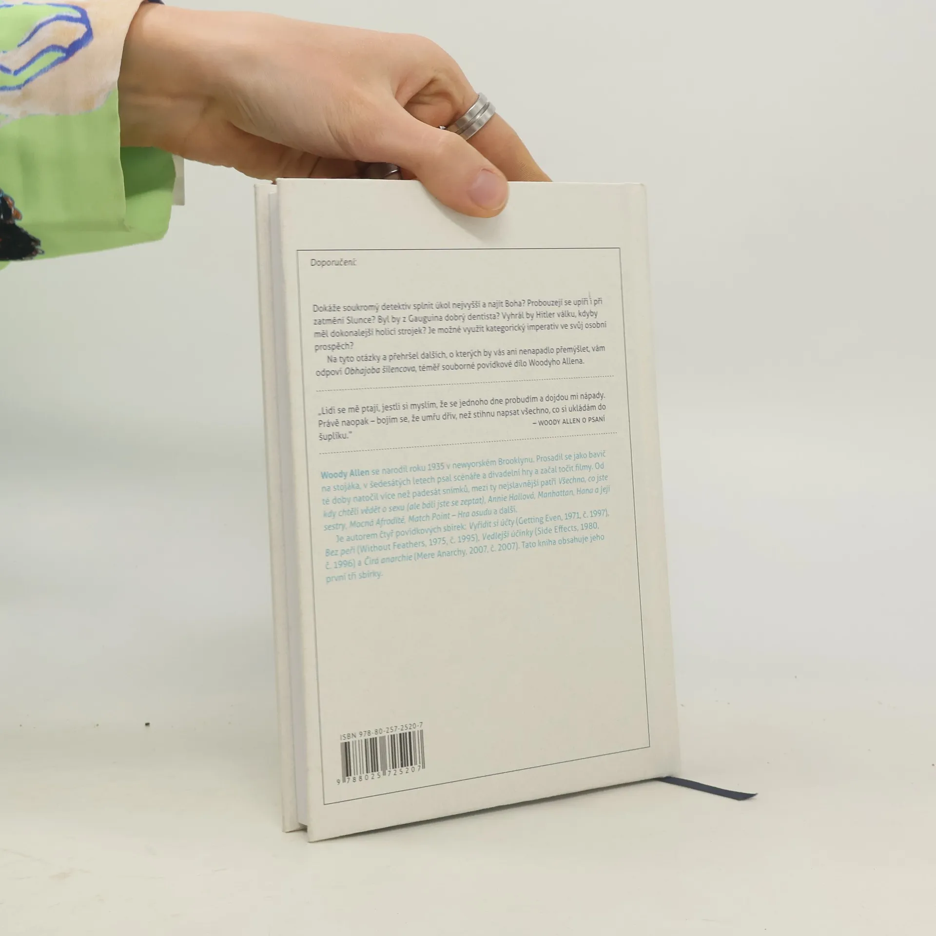 „Opět jsem se pokusil spáchat sebevraždu. Tentokrát jsem si navlhčil nos a strčil jej do zástrčky. Naneštěstí nastal zkrat a pouze jsem vykopl ledničku. Stále posedlý myšlenkou na smrt, ustavičně přemítám. Jestlipak je posmrtný život? Pokud ano, rozmění mi tam dvacku?“ V Obhajobě šílencově, téměř souborném vydání povídkového díla Woodyho Allena (obsahuje sbírky Vyřídit si účty, Bez peří a Vedlejší účinky) narazíte nejen na šílenou filozofii, ale též filozofické šílení. Je to totéž? A jak to poznat? Jak se vyrovnat s géniem, který pod vámi neustále podtrhává sesli? Obhajoba šílencova potěší každého fanouška Woodyho Allena. A koho nepotěší, ten je prostě šílenec.