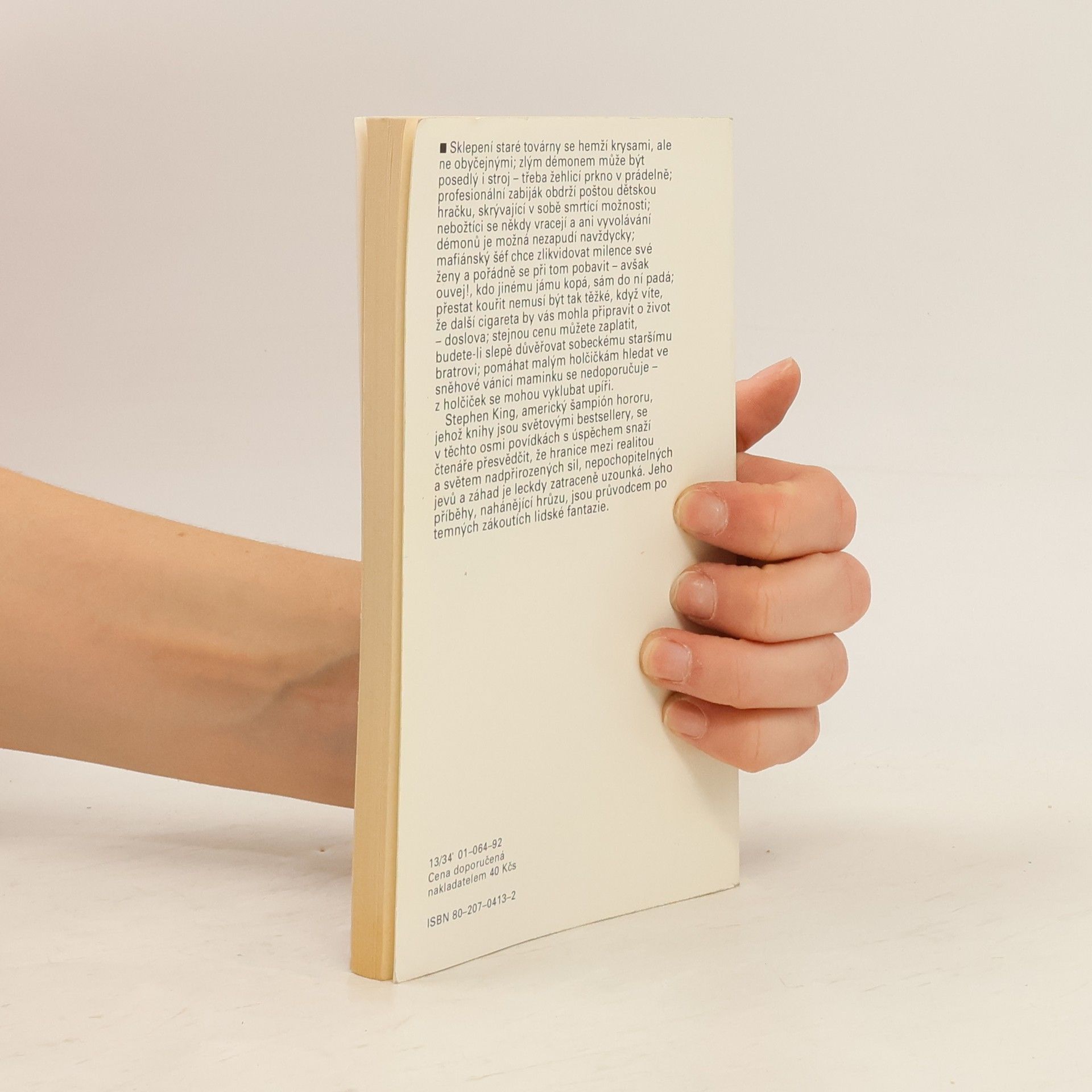Sklepení staré továrny se hemží krysami, ale ne obyčejnými; zlým démonem může být posedlý i stroj – třeba žehlící prkno v prádelně; profesionální zabiják obdrží poštou dětskou hračku, skrývající v sobě smrtící možnosti; nebožtíci se někdy vracejí a ani vyvolávání démonů je možná nezapudí navždycky; mafiánský šéf chce zlikvidovat milence své ženy a pořádně se při tom pobavit – avšak ouvej!, kdo jinému jámu kopá, sám do ní padá; přestat kouřit nemusí být tak těžké, když víte, že další cigareta by vás mohla připravit o život – doslova; stejnou cenu můžete zaplatit, budete-li slepě důvěřovat sobeckému staršímu bratrovi; pomáhat malým holčičkám hledat ve sněhové vánici maminku se nedoporučuje. Stephen King, americký šampión moderního hororu, jehož knihy jsou světovými bestsellery, se v těchto osmi povídkách s úspěchem snaží čtenáře přesvědčit, že hranice mezi realitou a světem nadpřirozených sil, nepochopitelných jevů a záhad je leckdy zatraceně uzounká. Jeho příběhy, nahánějící hrůzu, jsou průvodce po temných zákoutí lidské fantazie. Přeložil Pavel Medek.