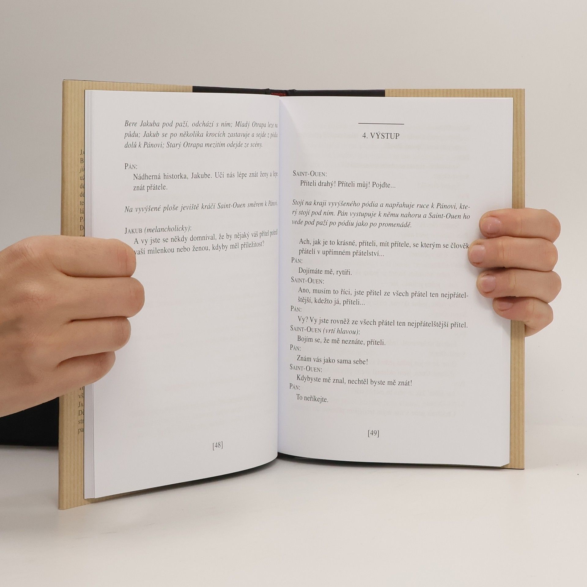 Znamenitá a úspěšná dramatizace Diderotova Jakuba Fatalisty, hravá i krutá studie proměn lidského osudu v neprohlédnutelném světě, je jediný autorův dramatický text patřící k dílům, která „má bez výhrad rád a chce vydávat“.