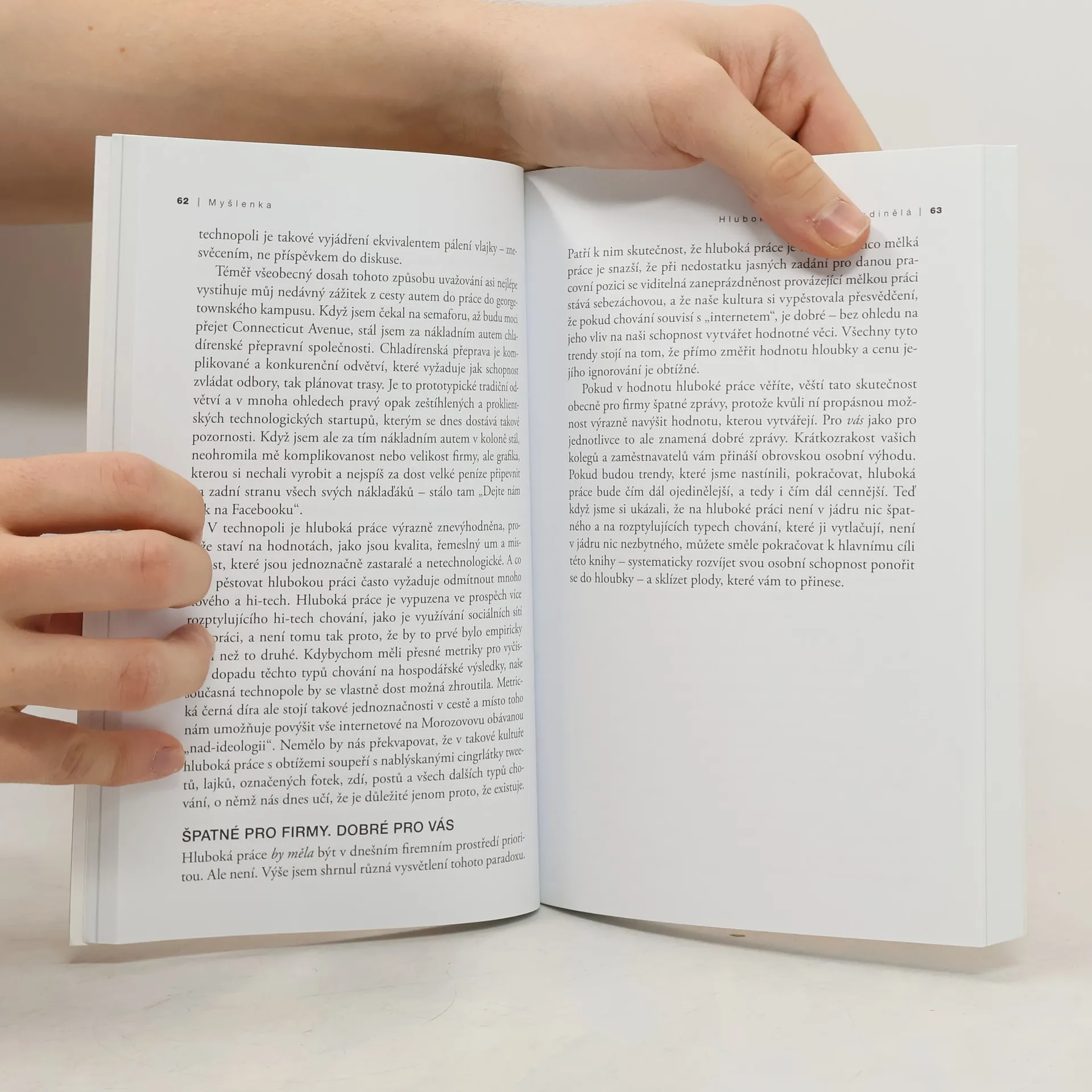 Hluboká práce je schopnost soustředit se na kognitivně náročné úkoly bez rozptylování, což vede k výjimečným výsledkům. Umožňuje rychle pochopit složité koncepty a vytvářet kvalitní výstupy v kratším čase, přičemž přináší pocit naplnění z dobře odvedené práce. V dnešní době, kdy většina lidí tráví čas v chaosu emailů a sociálních sítí, se tato schopnost stává vzácnou. Cal Newport v knize zpochybňuje tradiční pohled na rozptýlení a zdůrazňuje výhody soustředění a hluboké práce. V první části knihy argumentuje, že pěstování této dovednosti přináší obrovské výhody v téměř každé profesi. Následně představuje čtyři pravidla, která pomáhají přenastavit myšlení a zvyky k rozvoji schopnosti hluboce pracovat. Kniha kombinuje kulturní kritiku s praktickými radami, doplněná nezapomenutelnými příběhy, jako je Carl Jung, který si postavil kamennou věž pro lepší soustředění, či průkopník sociálních médií, jenž odletěl do Tokia, aby se vyhnul rozptýlení. Hluboká práce je nezbytnou příručkou pro každého, kdo usiluje o soustředěný úspěch v dnešním roztěkaném světě.