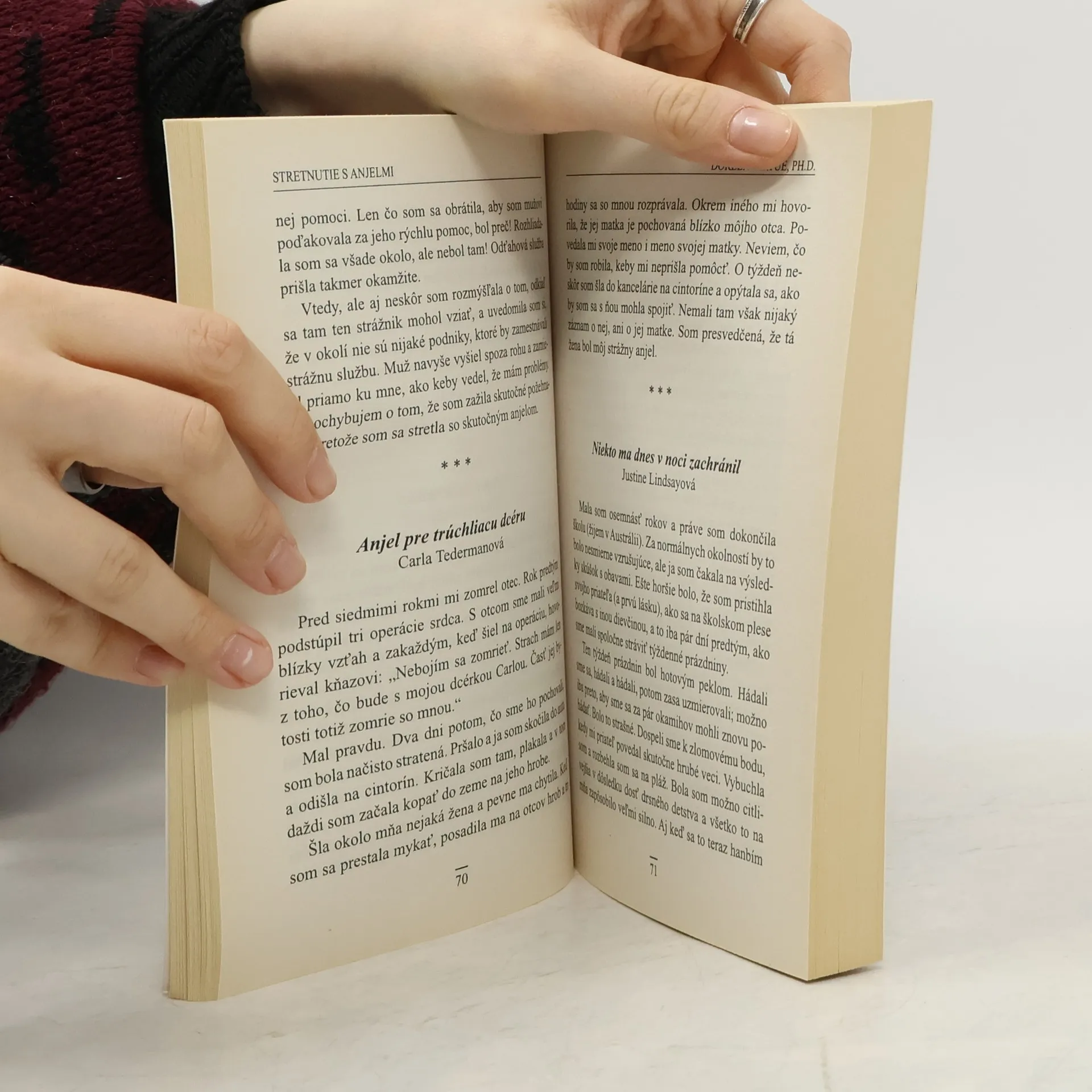 Zaujímavá zbierka skutočných príbehov. Aj v dnešnej modernej dobe veľa ľudí videlo anjelov, zosnulých blízkych či iné duchovné bytosti. Niektoré z týchto tajomných stretnutí sa odohrali vo sne, iné v krízovej situácii, kedy sa zrazu zjavil niekto neznámy, poskytol pomoc a hneď nato záhadne zmizol. Pôsobivé zážitky vás istotne zaujmú rovnako ako dôležité posolstvá, ktoré z nich vyplývajú. Nájdete tu aj praktické rady, ako so svojimi anjelmi nadviazať spojenie.