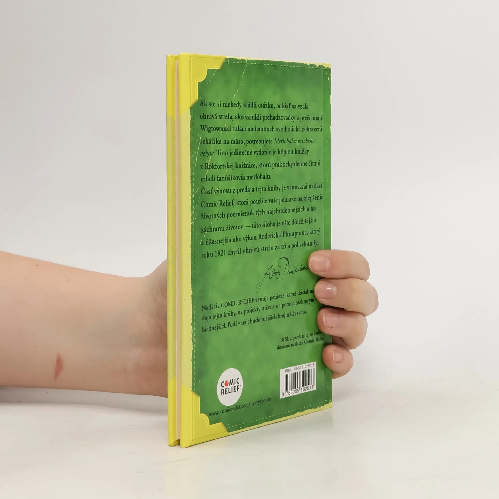 Toto jedinečné vydanie je kópiou knižky z Rokfordskej knižnice, ktorú prakticky denne čítajú mladí fanúšikovia metlolabu. Ak ste si niekedy kládli otázku, odkiaľ sa vzala ohnivá strela, ako vznikli prehadzovačky a prečo majú Wigtownskí tuláci na habitoch symbolické zobrazenie sekáčika na mäso, potrebujete túto knižku. Časť výnosu z predaja tejto knižky je venovaná nadácii Comic Relief, ktorá použije vaše peniaze na zlepšenie životných podmienok tých najchudobnejších a na záchranu životov - táto úloha je ešte dôležitejšia a úžasnejšia ako výkon RoderickaPlumptona, ktorý roku 1921 chytil ohnivú guľu za tri a pol sekundy. Upozornenie: Kniha je veľmi vhodná pre tých čitateľov, ktorí trpia úplne neškodnou závislosťou na čitaní príbehov o mladom čarodajníkovi Harrym Potterovi.