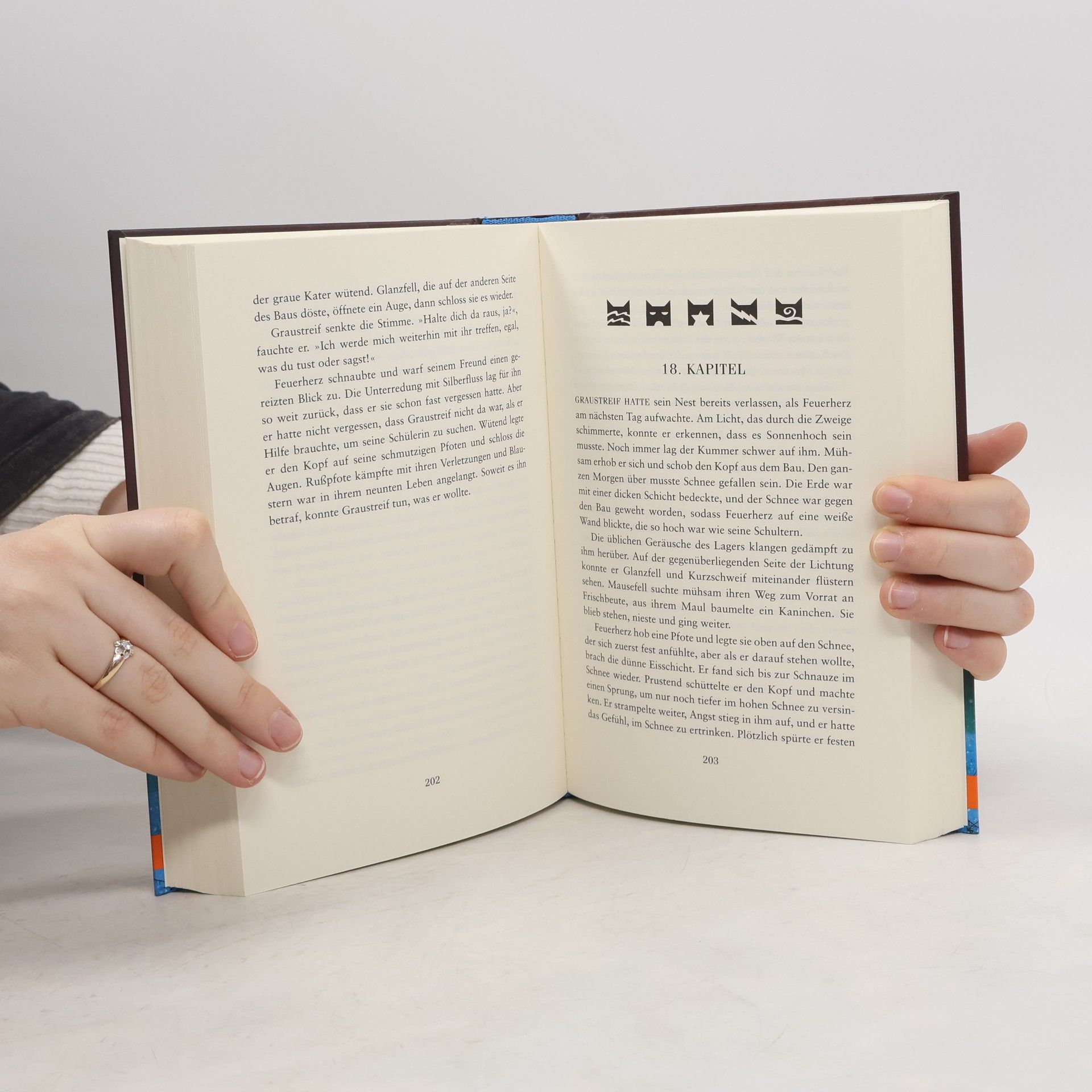 „Plötzlich ertönte vom Waldrand her ein schrilles, hohes Kreischen. Das Blut in Feuerherz’ Adern erstarrte – es war derselbe Schrei, den er in seinem Traum gehört hatte.“ Feuerherz, das ehemalige ‚Hauskätzchen’, ist ein mutiger Krieger des DonnerClans geworden. Als der Winter kommt, spitzt sich die Situation im Wald zu: Nachdem der WindClan von Katzen des SchattenClans vertrieben wurde, ist das Gleichgewicht der Clans gestört. Hunger und Not, geheime Bündnisse und die Machtgier einzelner Katzen bedrohen den Frieden im Wald. Ausgerechnet jetzt verstrickt sich Feuerherz’ bester Freund Graustreif in eine gefährliche Liebe. Als die beiden Freunde aufbrechen, um den WindClan zurückzuholen, kommt es zu einem schrecklichen Unfall …