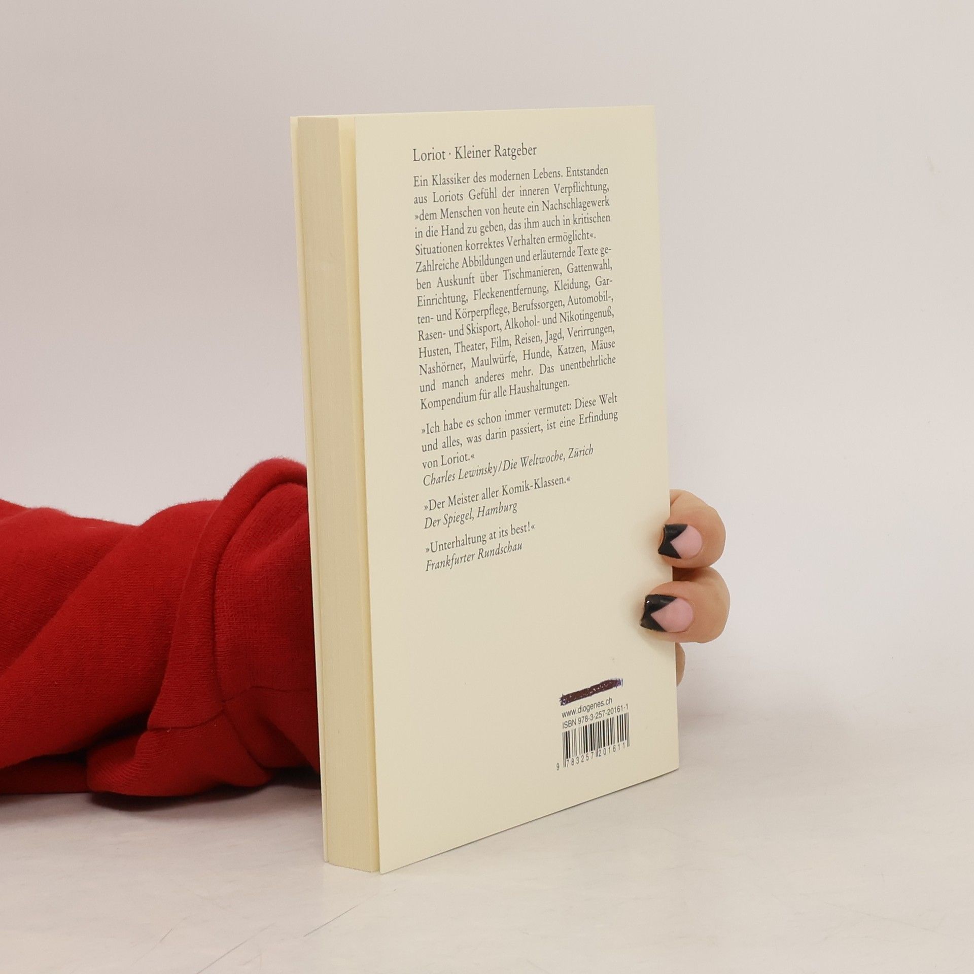 Ein Klassiker des modernen Lebens. Entstanden aus Loriots Gefühl der inneren Verpflichtung, »dem Menschen von heute ein Nachschlagewerk in die Hand zu geben, das ihm auch in kritischen Situationen korrektes Verhalten ermöglicht.« Behandelt werden Bereiche wie Grund und Boden, Daheim, Das Automobil, Auf Reisen, Gesellschaftsspiele, Umgang mit Tieren und viele mehr. Ein Ratschlag zum Erwerb dieses Buches: sie fragen danach in der nächsten Buchhandlung oder drücken jetzt auf den Button In den Warenkorb.
