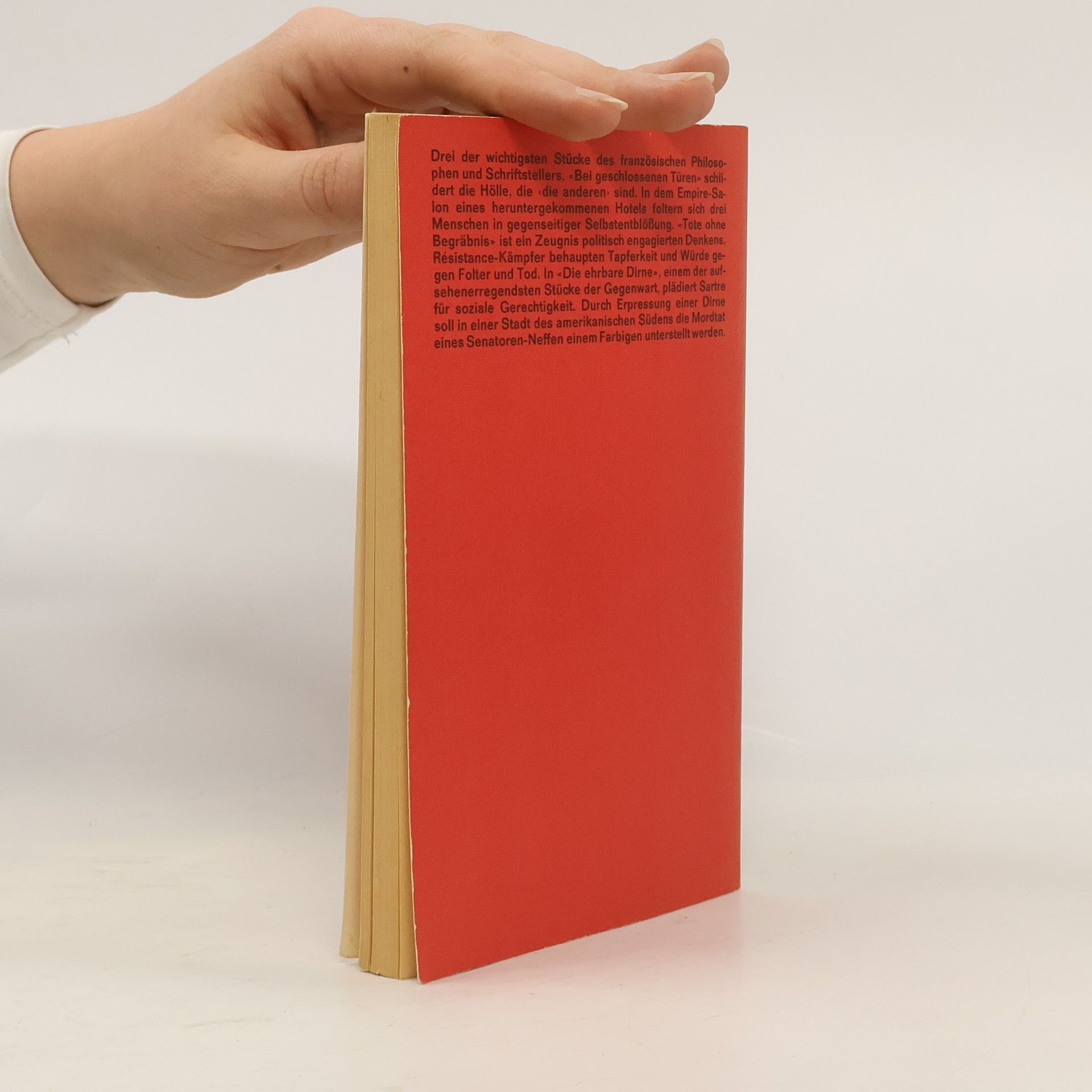 Drei der wichtigsten Stücke des französischen Philosophen und Schriftstellers. «Bei geschlossenen Türen» schildert die Hölle, die ‹die anderen› sind. In dem Empire-Salon eines heruntergekommenen Hotels foltern sich drei Menschen in gegenseitiger Selbstentblößung. «Tote ohne Begräbnis» ist ein Zeugnis politisch engagierten Denkens. Resistance-Kämpfer behaupten Tapferkeit und Würde gegen Folter ud Tod. In die «Die ehrbare Dirne», einem der aufsehenerregensten Stücke der Gegenwart, plädiert Sartre für soziale Gerechtigkeit. Durch Erpressung einer Dirne soll in einer Stadt des amerikanischen Südens die Mordtat eines Senatoren-Neffen einem Farbigen unterstellt werden.