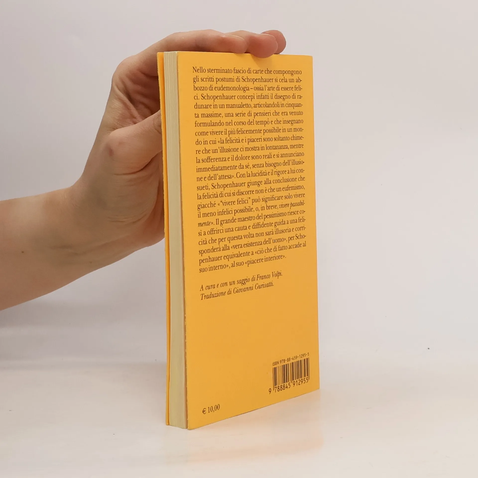 Nello sterminato fascio di carte che compongono gli scritti postumi di Schopenhauer si cela un abbozzo di eudemonologia – ossia l’arte di essere felici. Schopenhauer concepì infatti il disegno di radunare in un manualetto, articolandoli in cinquanta massime, una serie di pensieri che era venuto formulando nel corso del tempo e che insegnano come vivere il più felicemente possibile in un mondo in cui «la felicità e i piaceri sono soltanto chimere che un’illusione ci mostra in lontananza, mentre la sofferenza e il dolore sono reali e si annunciano immediatamente da sé, senza bisogno dell’illusione e dell’attesa». Con la lucidità e il rigore a lui consueti, Schopenhauer giunge alla conclusione che la felicità di cui si discorre non è che un eufemismo, giacché «“vivere felici” può significare solo vivere il meno infelici possibile, o, in breve, vivere passabilmente». Il grande maestro del pessimismo riesce così a offrirci una cauta e diffidente guida a una felicità che per questa volta non sarà illusoria e corrisponderà alla «vera esistenza dell’uomo», per Schopenhauer equivalente a «ciò che di fatto accade al suo interno», al suo «piacere interiore».