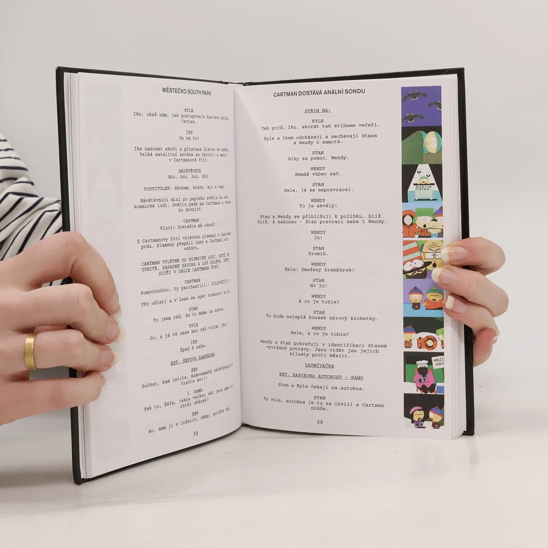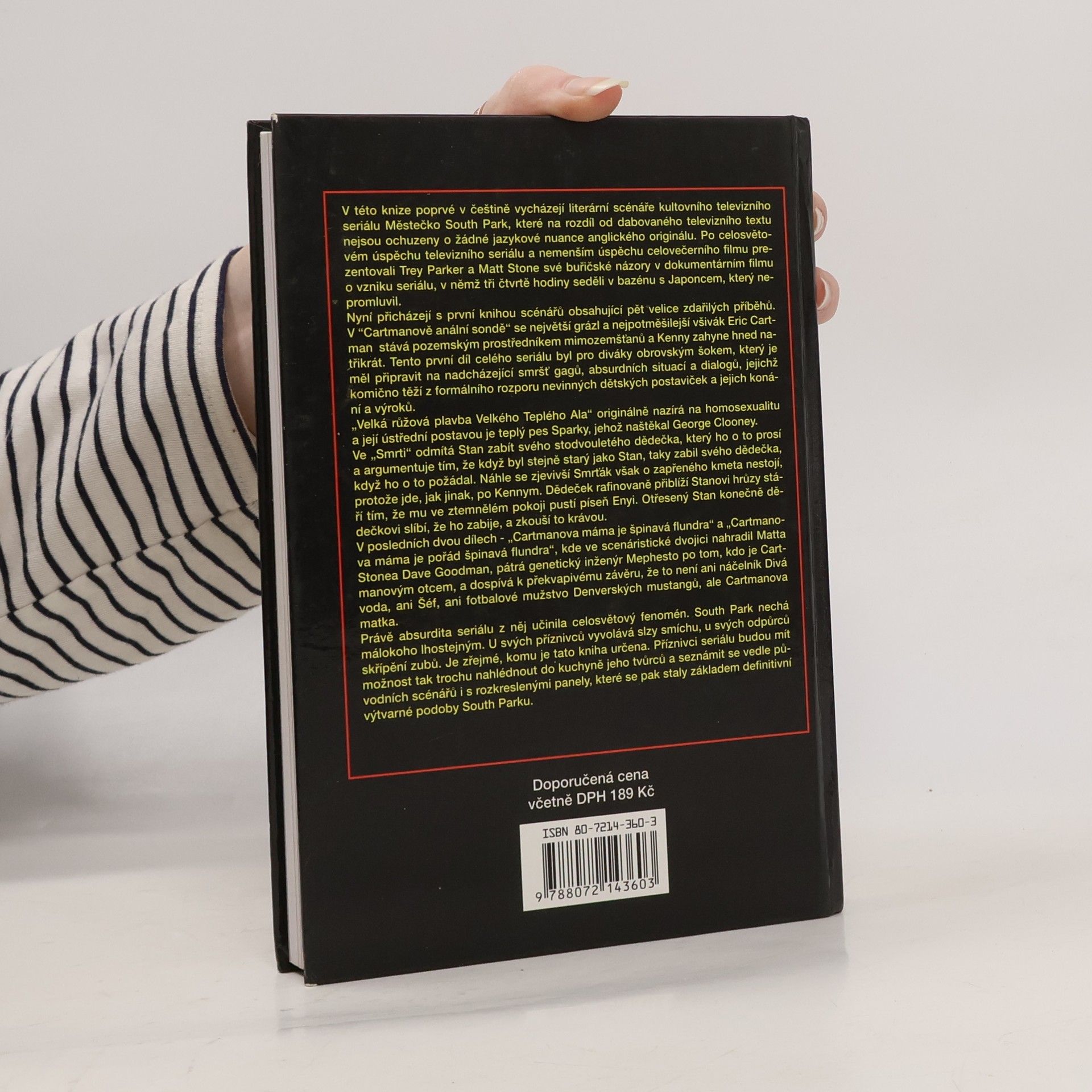 V této knize poprvé v češtině vycházejí literární scénáře kultovního televizního seriálu Městečko South Park, které na rozdíl od dabovaného televizního textu nejsou ochuzeny o žádné jazykové nuance anglického originálu. Po celosvětovém úspěchu televizního seriálu a nemenším úspěchu celovečerního filmu prezentovali autoři své buřičské názory v dokumentárním filmu o vzniku seriálu, v němž tři čtvrtě hodiny seděli v bazénu s Japoncem, který nepromluvil. Nyní přicházejí s první knihou scénářů obsahující pět velice zdařilých příběhů, jejichž komično těží z formálního rozporu nevinných dětských postaviček a jejich konání a výroků. A tak se setkáváme s Kennym, Ericem Cartmanem, Stanem a mnoha dalšími.