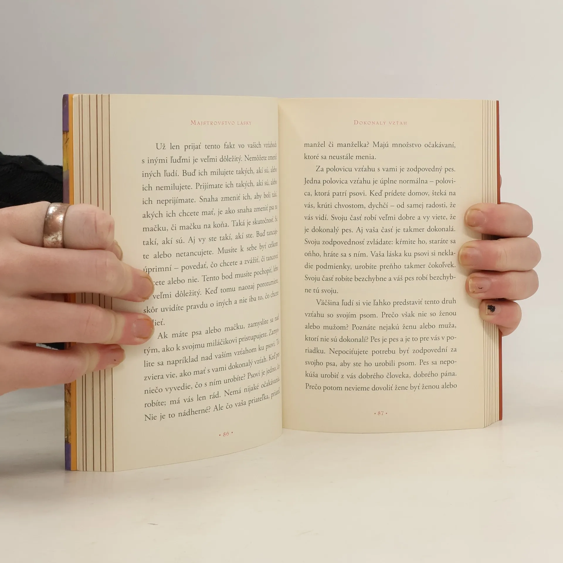 Autor, nositeľ múdrosti starých Toltékov v knihe prináša hlboké poznanie majstrovstva harmonických vzťahov. Hovorí o návykoch myslenia a konania vkladaných do spoločenských pravidiel. O Strachu z odmietania, nepochopenia, neúcty. Vysvetľuje ako a prečo vzniká emocionálna či fyziologická bolesť. Hovorí, ako rozoznať lásku a sebectvo... Ako sa učíme klamať seba samých. Vedie nás do tajomstva vlastného vnútra. Učí nás poznávať, z čoho pramení ne-pochopenie seba aj tých, ktorých milujeme. Predkladá východiská, nový spôsob myslenia. Mnohí sa už o túto zmenu v živote pokúšajú. Ale keď nevidia úspech hneď, tak sa vracajú do svojich nefunkčných koľají. Autor vraví: " Cvičenie robí Majstra!"