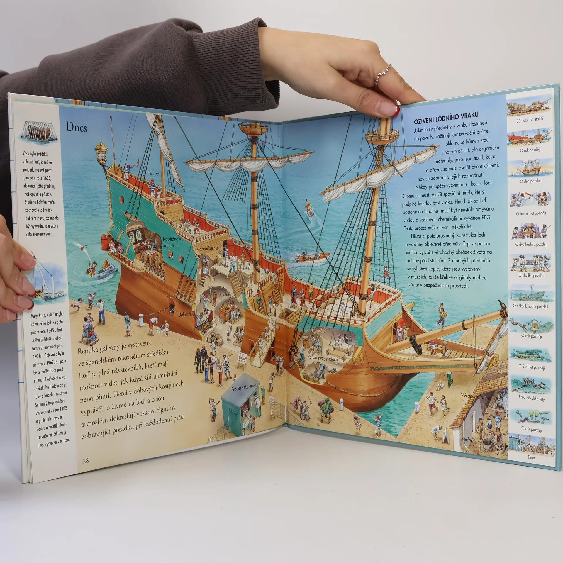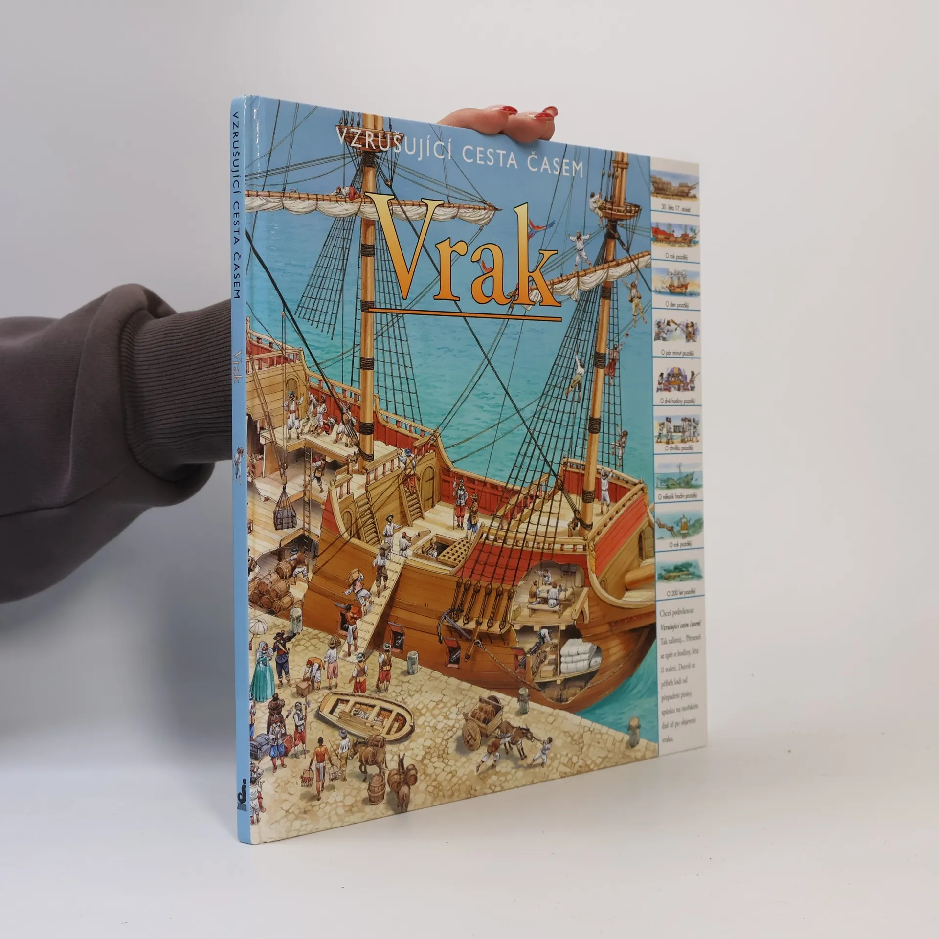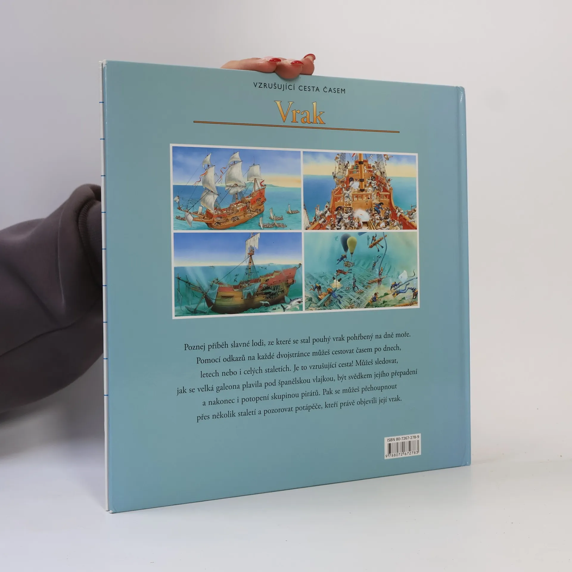 Chceš podniknout Vzrušující cestu časem? Tak zalistuj. Přeneseš se zpět o hodiny, léta či staletí. Poznej příběh slavné lodi, ze které se stal pouhý vrak pohřbený na dně moře. Pomocí odkazů na každé dvojstránce můžeš cestovat časem po dnech, letech nebo i celých staletích. Je to vzrušující cesta! Můžeš sledovat, jak se velká galeona plavila pod španělskou vlajkou, být svědkem jejího přepadení a nakonec i potopení skupinou pirátů. Pak se můžeš přehoupnout přes několik staletí a pozorovat potápěče, kteří právě objevili její vrak.