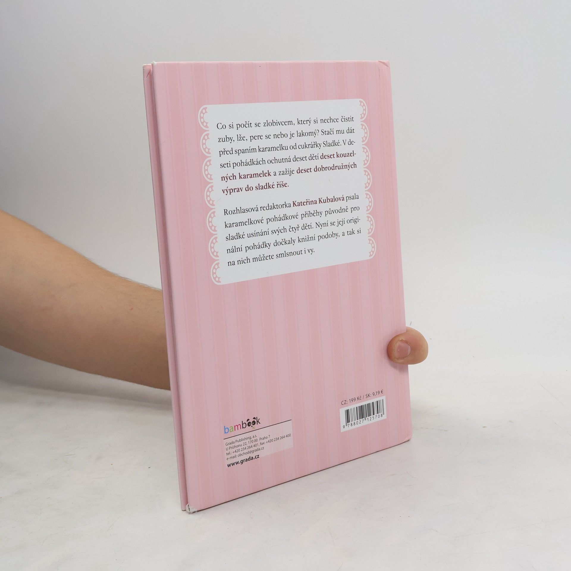 Paní cukrářka Sladká dělá výborné karamelky. Kromě toho, že báječně chutnají, mají navíc kouzelnou moc. Dítě, které je ochutná, přenese jejich slaďoučká chuť do čarovné říše, ve které se děje spousta tajemných věcí – lesem se tu potulují neuklizené hračky, u rybníka pláče Bebíčková vrba a potkat můžete i obra Koblihouna. Rozhlasová redaktorka Kateřina Kubalová psala karamelkové pohádkové příběhy původně pro sladké usínání svých čtyř dětí. Nyní se dočkaly knižní podoby, a tak si na nich můžete smlsnout i vy.