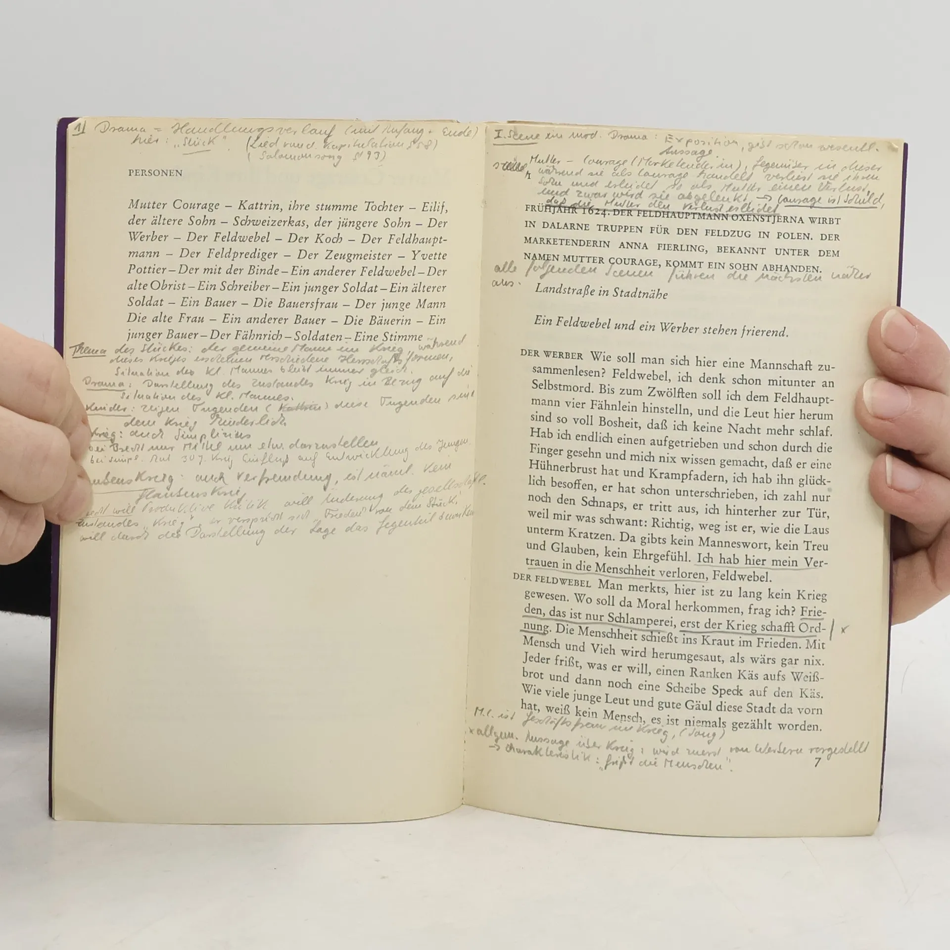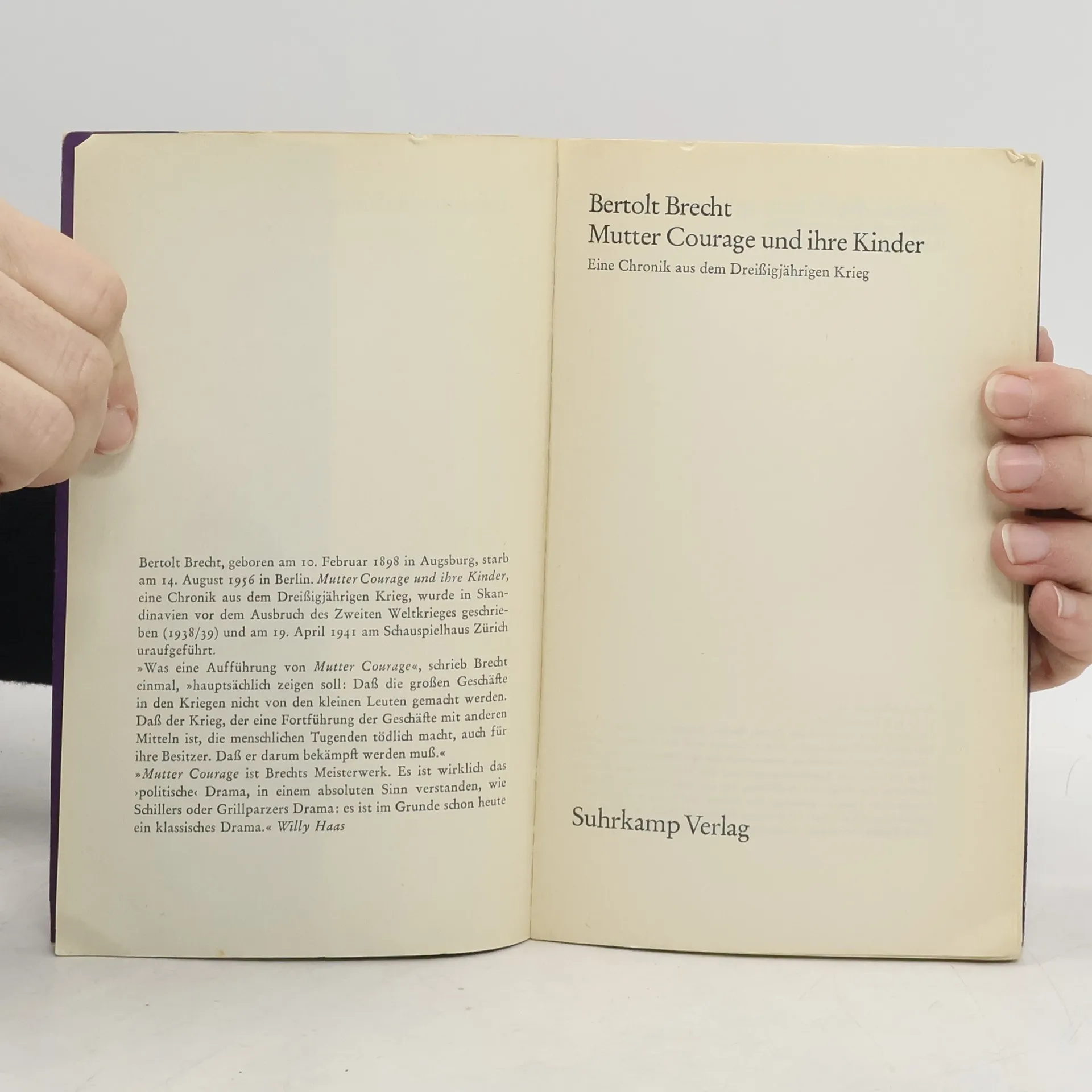 Mutter Courage und ihre Kinder, eine Chronik aus dem Dreißigjährigen Krieg. »Was eine Aufführung von Mutter Courage«, schrieb Brecht einmal, »hauptsächlich zeigen soll: Daß die großen Geschäfte in den Kriegen nicht von den kleinen Leuten gemacht werden. Daß der Krieg, der eine Fortführung der Geschäfte mit anderen Mitteln ist, die menschlichen Tugenden tödlich macht, auch für ihre Besitzer. Daß er darum bekämpft werden muß.«