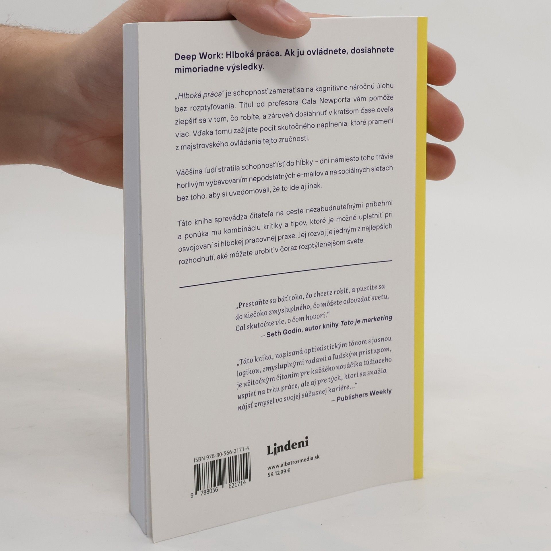 Ak ju ovládnete, dosiahnete mimoriadne výsledky. „Hlboká práca“ je schopnosť zamerať sa na kognitívne náročnú úlohu bez rozptyľovania. Titul od profesora Cala Newporta vám pomôže zlepšiť sa v tom, čo robíte, a zároveň dosiahnuť v kratšom čase oveľa viac. Vďaka tomu zažijete pocit skutočného naplnenia, ktoré pramení z majstrovského ovládania tejto zručnosti. Väčšina ľudí stratila schopnosť ísť do hĺbky – dni namiesto toho trávia horlivým vybavovaním nepodstatných e-mailov a na sociálnych médiách, bez toho aby si uvedomovali, že to ide aj inak. Táto kniha sprevádza čitateľa na ceste nezabudnuteľnými príbehmi a ponúka mu kombináciu kritiky a tipov, ktoré je možné uplatniť si pri osvojovaní hlbokej pracovnej praxe. Jej rozvoj je jedným z najlepších rozhodnutí, ktoré môžete urobiť v stále viac rozptýlenom svete. „Prestaňte sa báť toho, čo chcete robiť, a pustite sa do niečoho zmysluplného, čo môžete odovzdať svetu. Cal skutočne vie, o čom hovorí.“ -Seth Godin, autor knihy Toto je marketing „Táto kniha, napísaná optimistickým tónom s jasnou logikou, zmysluplnými radami a ľudským prístupom, je užitočným čítaním pre každého nováčika túžiaceho uspieť na trhu práce, ale aj pre tých, ktorí sa snažia nájsť zmysel vo svojej súčasnej kariére...“ -Publishers Weekly