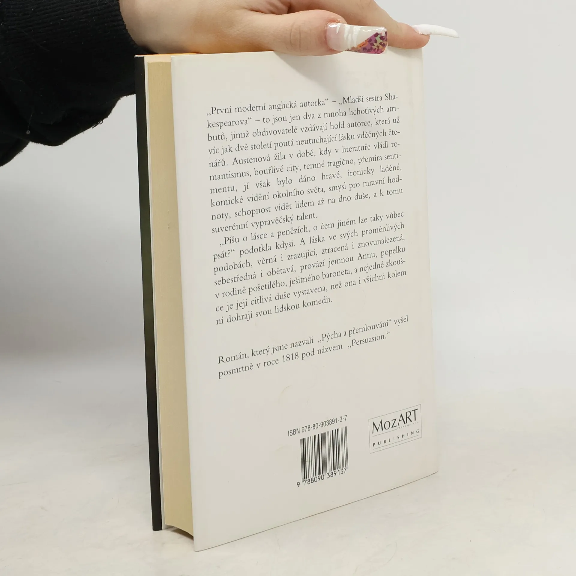 „První moderní anglická autorka“ – „Mladší sestra Shakespearova“ – to jsou jen dva z mnoha lichotivých atributů, jimiž obdivovatelé vzdávají hold autorce, která už víc jak dvě století poutá neutuchající lásku vděčných čtenářů. Austenová žila v době, kdy v literatuře vládl romantismus, bouřlivé city, temné tragično, přemíra sentimentu, jí však bylo dáno hravé, ironicky laděné, komické vidění okolního světa, smysl pro mravní hodnoty, schopnost vidět lidem až na dno duše, a k tomu suverénní vypravěčský talent. „Píšu o lásce a penězích, o čem jiném lze taky vůbec psát?“ podotkla kdysi. A láska ve svých proměnlivých podobách, věrná i zrazující, ztracená i znovunalezená, sebestředná i obětavá, provází jemnou Annu, popelku v rodině pošetilého, ješitného baroneta, a nejedné zkoušce je její citlivá duše vystavena, než ona i všichni kolem ní dohrají svou lidskou komedii. Román, který jsme nazvali „Pýcha a přemlouvání“ vyšel posmrtně v roce 1818 pod názvem „Persuasion.“