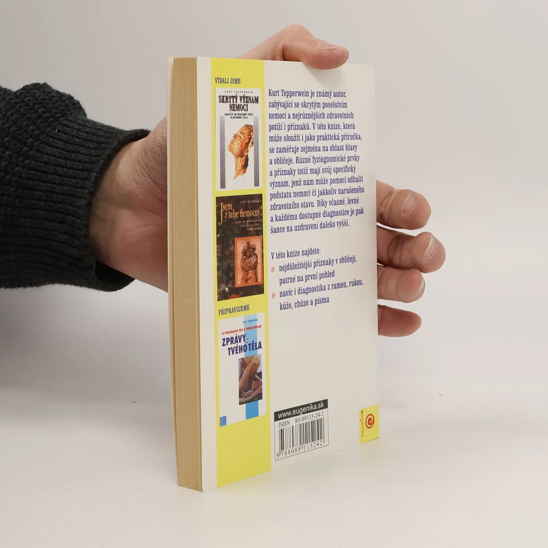 Kniha německého léčitele a terapeuta pojednává o tom, co vše lze vyčíst z jednotlivých obličejových partií o zdraví a nemoci. Ve stručnosti je rovněž pohovořeno o typech chůze, písma, způsobech držení těla či tvarech nehtů, z nichž také můžeme „číst“ varovné signály, týkající se našeho zdravotního stavu. K dílčím příznakům v obličeji a na těle jsou připojeny odpovídající tělesné orgány a jejich poruchy. Pro přehlednost a názornost autor jednotlivé symptomy abecedně seřadil a doplnil ilustracemi. Pozorný čtenář, dbající rad autora, by měl s pomocí této knihy umět lépe rozumět sobě samému, uchovat si zdraví na těle i na duchu a rozpoznat příznaky nemoci ještě dříve, než propukne.