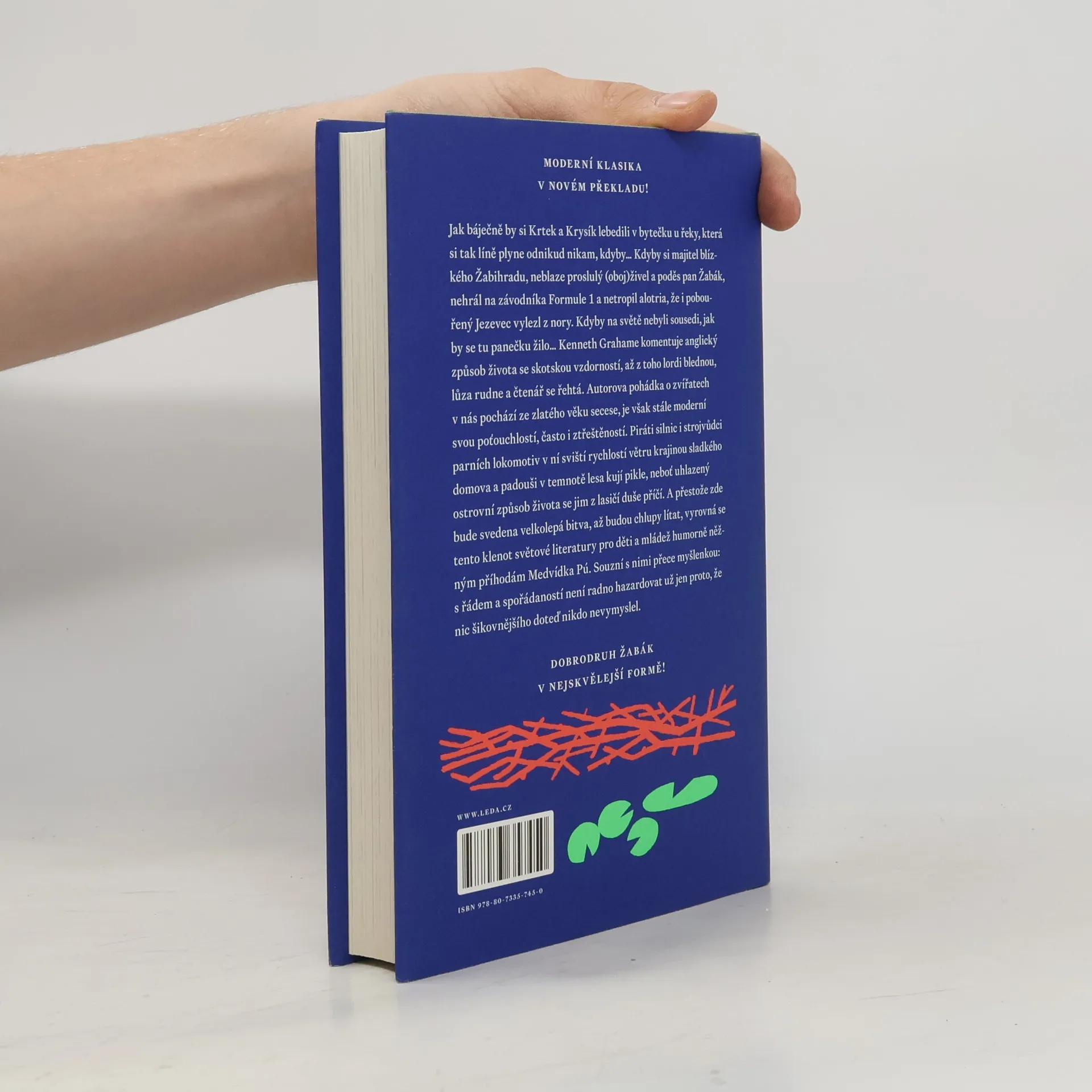 Jak báječně by si Krtek a Krysík lebedili v bytečku u řeky, která si tak líně plyne odnikud nikam, kdyby... Kdyby si majitel blízkého Žabihradu, neblaze proslulý (oboj)živel a poděs pan Žabák, nehrál na závodníka Formule 1 a netropil alotria, že i pobouřený Jezevec vylezl z nory. Kdyby na světě nebyli sousedi, jak by se tu panečku žilo... Kenneth Grahame komentuje anglický způsob života se skotskou vzdorností, až z toho lordi blednou, lůza rudne a čtenář se řehtá. Autorova pohádka o zvířatech v nás pochází ze zlatého věku secese, je však stále moderní svou poťouchlostí, často i ztřeštěností. Piráti silnic i strojvůdci parních lokomotiv v ní sviští rychlostí větru krajinou sladkého domova a padouši v temnotě lesa kují pikle, neboť uhlazený ostrovní způsob života se jim z lasičí duše příčí. A přestože zde bude svedena velkolepá bitva, až budou chlupy lítat, vyrovná se tento klenot světové literatury pro děti a mládež humorně něžným příhodám Medvídka Pú. Souzní s nimi přece myšlenkou: s řádem a spořádaností není radno hazardovat už jen proto, že nic šikovnějšího doteď nikdo nevymyslel.