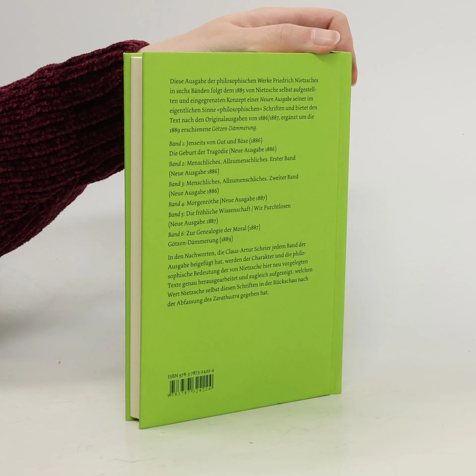 1885 plante Friedrich Nietzsche eine neue Ausgabe seiner Werke, um das Einzigartige seiner Philosophie hervorzuheben. Claus-Artur Scheier gibt diese Sammlung in sechs Bänden heraus, die bedeutende Texte wie "Jenseits von Gut und Böse" und "Zur Genealogie der Moral" umfasst. Diese Ausgabe folgt Nietzsches ursprünglichem Konzept und bietet eine umfassende Sicht auf seine Gedanken.