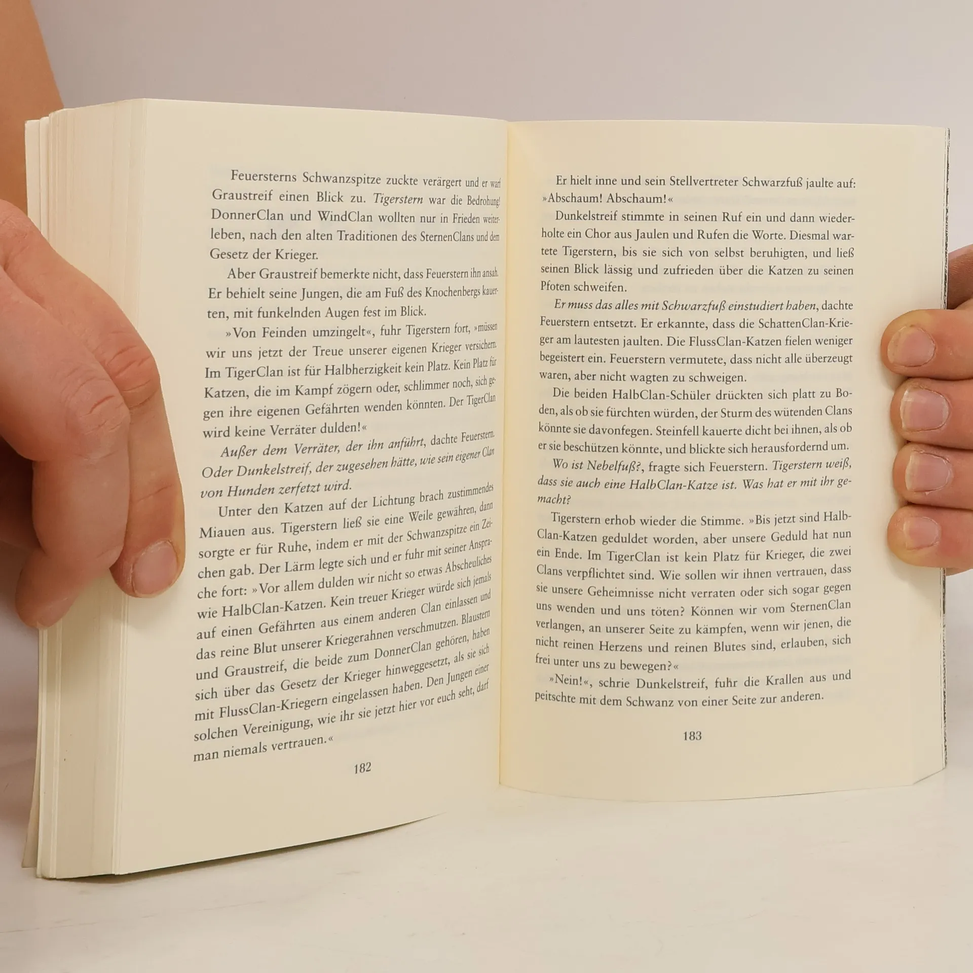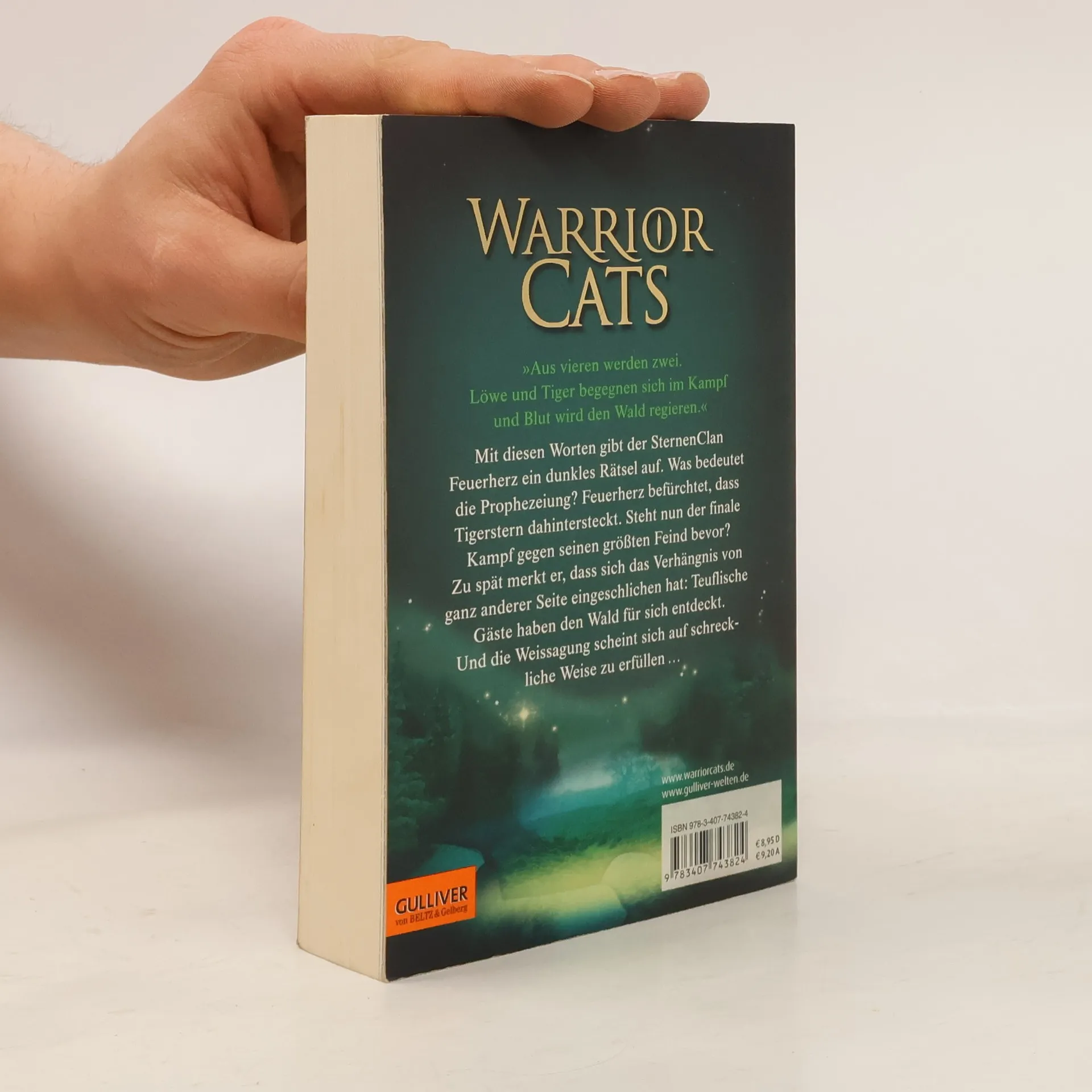 »Atmosphärisch sehr dicht, lässt der sechste Band um die Waldkatzen dem Leser kaum Zeit zum Luftholen.« Fränkische Nachrichten »Aus vieren werden zwei. Löwe und Tiger begegnen sich im Kampf und Blut wird den Wald regieren.« Mit diesen Worten gibt der SternenClan Feuerherz ein dunkles Rätsel auf. Was bedeutet die Prophezeiung? Feuerherz befürchtet, dass Tigerstern dahintersteckt. Steht nun der finale Kampf gegen seinen größten Feind bevor? Zu spät merkt er, dass sich das Verhängnis von ganz anderer Seite eingeschlichen hat: Teuflische Gäste haben den Wald für sich entdeckt. Und die Weissagung scheint sich auf schreckliche Weise zu erfüllen …