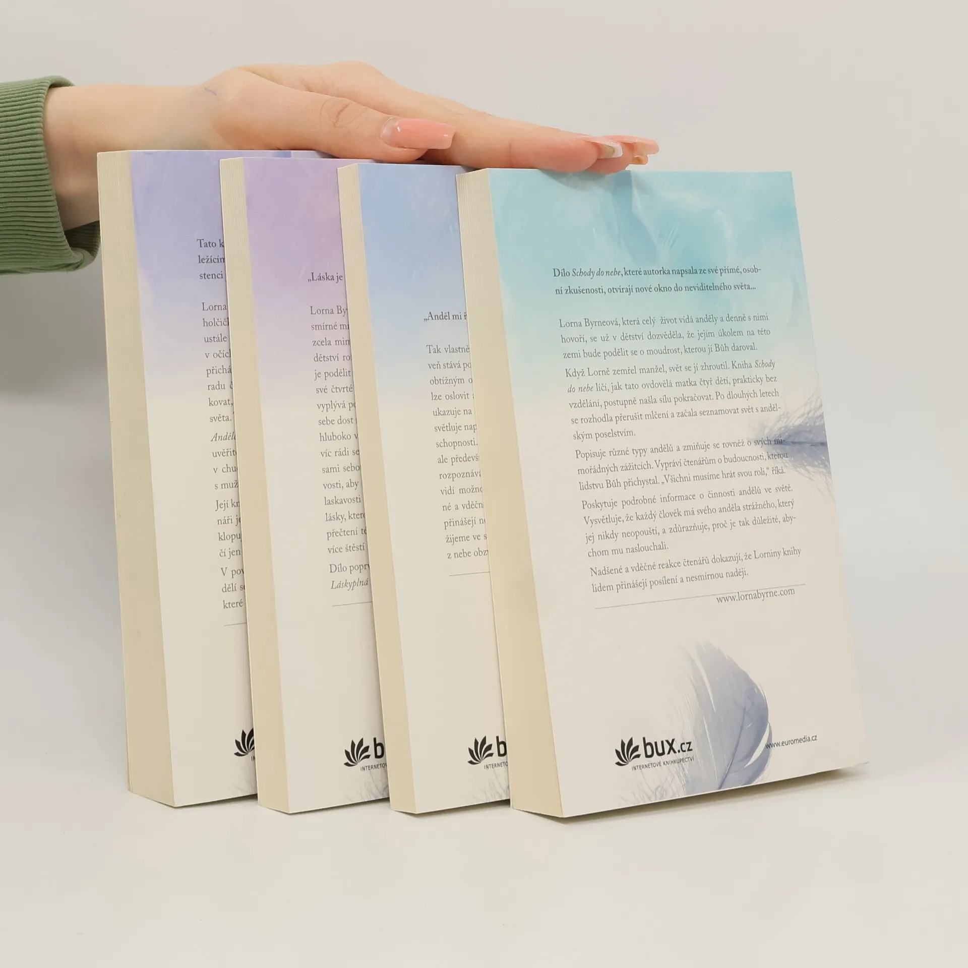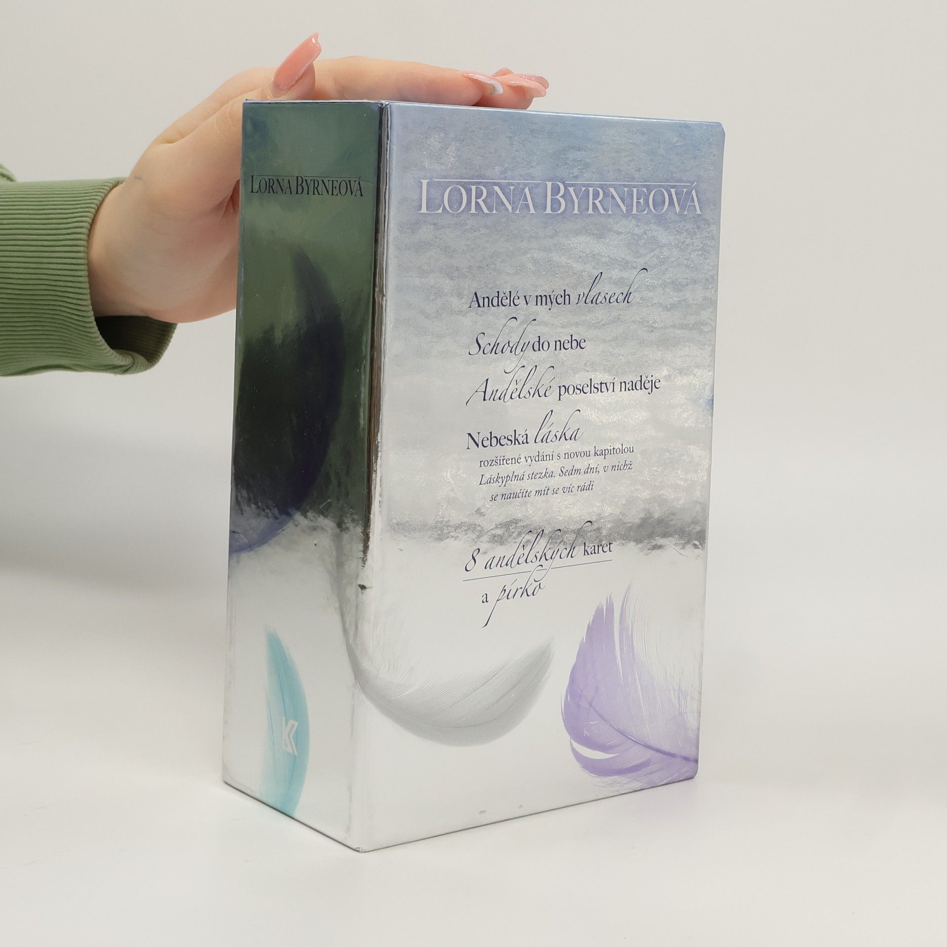 Lorna Byrneová (1953) je irská mystička a autorka mezinárodních bestsellerů. Od dětství má výjimečnou schopnost vidět anděly; po celý život se od nich dozvídá informace, které mohou být pro svět zásadní. Poprvé nyní vychází komplet všech jejích děl, obsahující autobiografickou knihu Andělé v mých vlasech, volné pokračování s názvem Schody do nebe, dále Andělské poselství naděje, v němž autorka radí, jak oslovovat anděly s prosbou o pomoc, a zatím poslední Nebeskou lásku, která je rozšířena o novou kapitolu Láskyplná stezka. Sedm dní, v nichž se naučíte mít víc rádi sami sebe. Čtenáře potěší i 8 andělských karet a pírko.