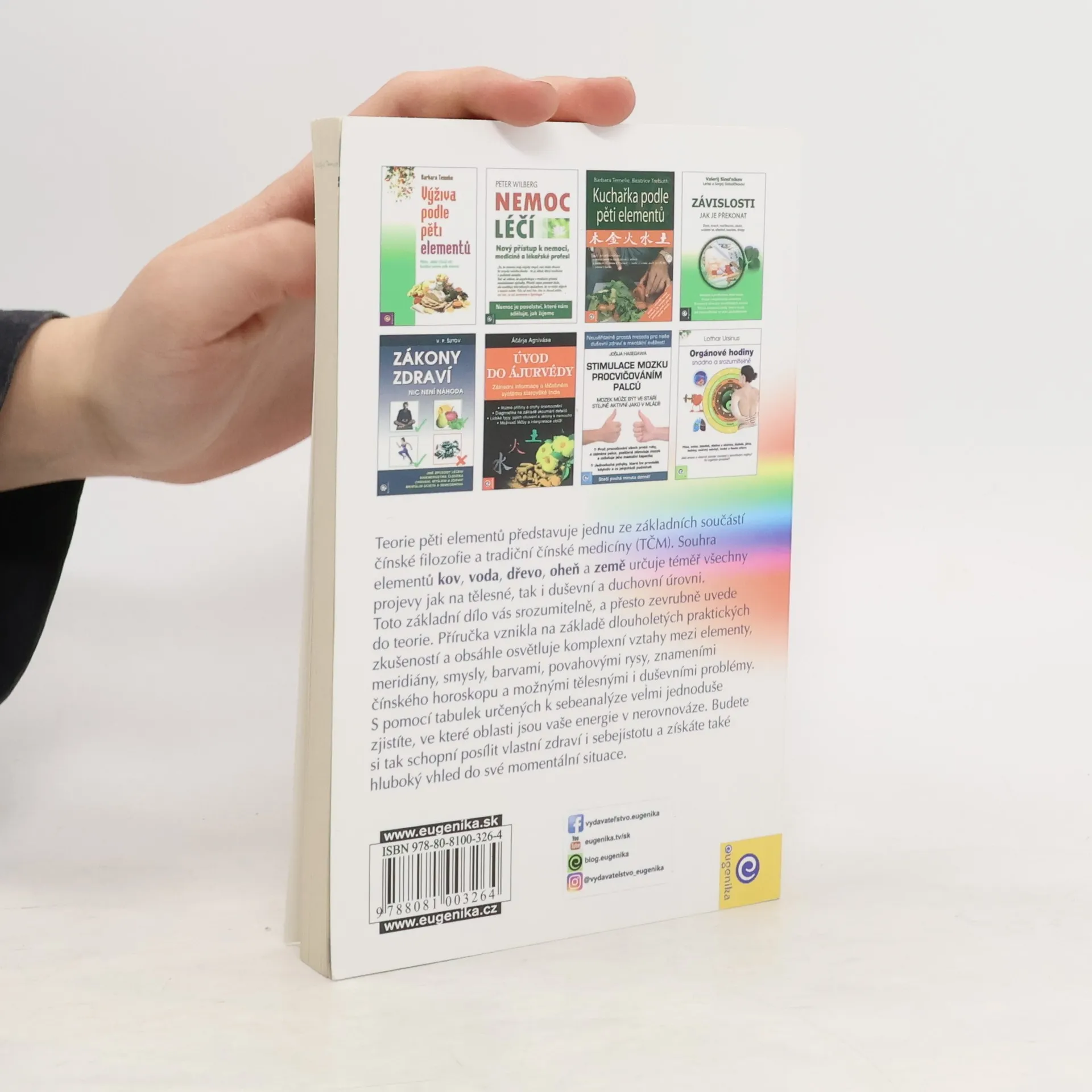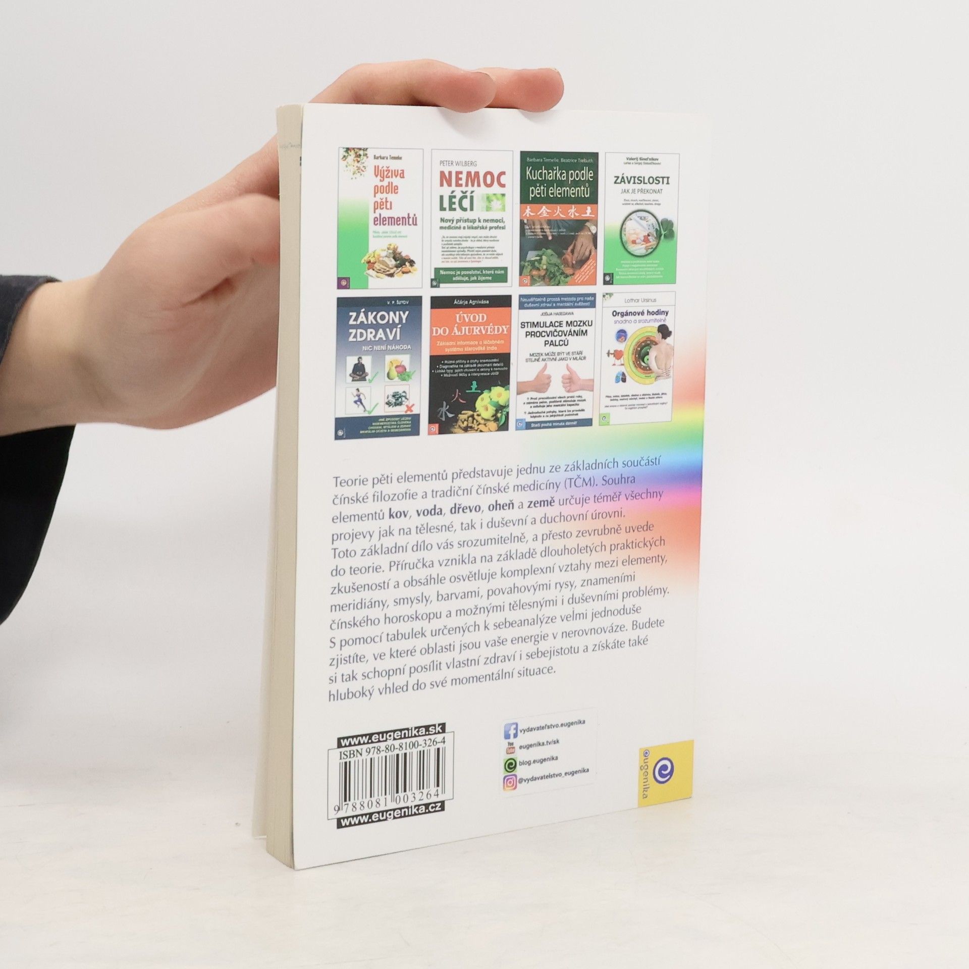 Teorie pěti elementů představuje jednu ze základních součástí čínské filozofie a tradiční čínské medicíny (TČM). Souhra elementů kov, voda, dřevo, oheň a země určuje téměř všechny projevy jak na tělesné, tak na duševní úrovni. Toto základní dílo vás srozumitelně, a přesto zevrubně uvede do teorie. Příručka vznikla na základě dlouholetých praktických zkušeností a obsáhle osvětluje komplexní vztahy mezi elementy, meridiány, smysly, barvami, povahovými rysy, znameními čínského horoskopu a možnými tělesnými i duševními problémy. S pomocí tabulek určených k sebeanalýze velmi jednoduše zjistíte, ve které oblasti se vaše energie nacházejí v nerovnováze. Budete si tak schopní posílit vlastní zdraví i sebejistotu a získáte také hluboký vhled do své momentální situace.
