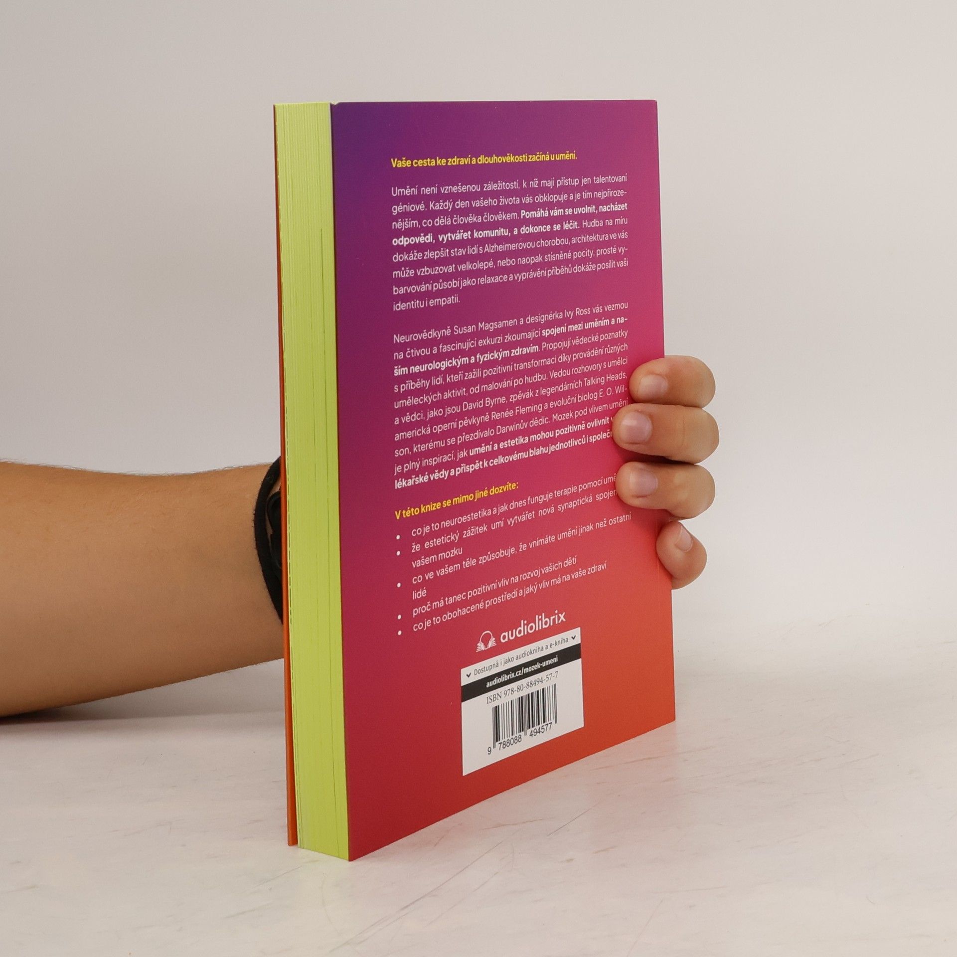 Vaše cesta ke zdraví a dlouhověkosti začíná u umění, které není vyhrazeno pouze talentovaným géniům, ale obklopuje nás každý den. Umění pomáhá uvolnit se, nacházet odpovědi, vytvářet komunitu a dokonce se léčit. Například hudba může zlepšit stav lidí s Alzheimerovou chorobou, architektura ovlivňuje naše pocity a vyprávění příběhů posiluje identitu a empatii. Neurovědkyně Susan Magsamen a designérka Ivy Ross zkoumají spojení mezi uměním a naším neurologickým a fyzickým zdravím. Kombinují vědecké poznatky s příběhy lidí, kteří zažili pozitivní transformaci díky uměleckým aktivitám, jako je malování a hudba. V knize se objevují rozhovory s umělci a vědci, včetně Davida Byrnea, Renée Fleming a E. O. Wilsona. Ukazují, jak umění a estetika mohou ovlivnit lékařskou vědu a přispět k blahu jednotlivců i společnosti. Z této knihy se dozvíte o neuroestetice a terapii pomocí umění, jak estetické zážitky vytvářejí nová synaptická spojení v mozku, proč vnímáte umění různě než ostatní, jak tanec pozitivně ovlivňuje vývoj dětí a co je obohacené prostředí a jeho vliv na zdraví.