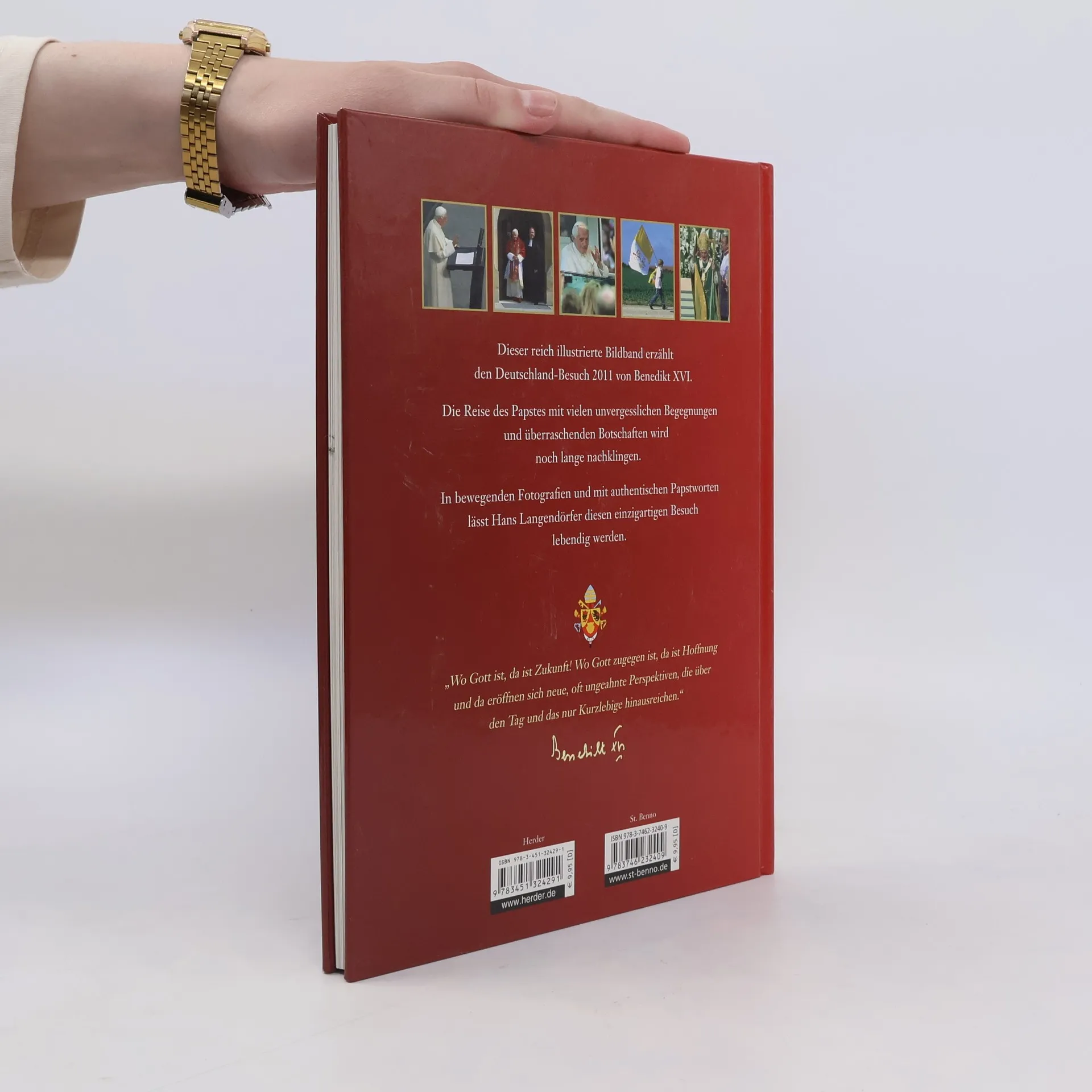 Wenn Papst Benedikt XVI. am 25. September von seinem Staatsbesuch in Deutschland nach Rom zurückkehrt, hat er nicht nur die Bundeshauptstadt, sondern auch die Bistümer Berlin, Erfurt und Freiburg besucht. Er hat vor dem Bundestag gesprochen, hat die Spitzen des Staates getroffen und ist Repräsentanten anderer Religionen begegnet. Auf besonderen eigenen Wunsch bildet das ökumenische Gespräch einen Schwerpunkt der Reise ins Mutterland der Reformation. Mit Hunderttausenden Menschen hat er Gottesdienste gefeiert und sie zu Glauben, Hoffnung und Liebe ermutigt. Brillante Fotografien und markante Texte halten in Wort und Bild die entscheidenden Szenen, Begegnungen und Botschaften fest. Das Buch erscheint wenige Tage nach dem Papstbesuch.