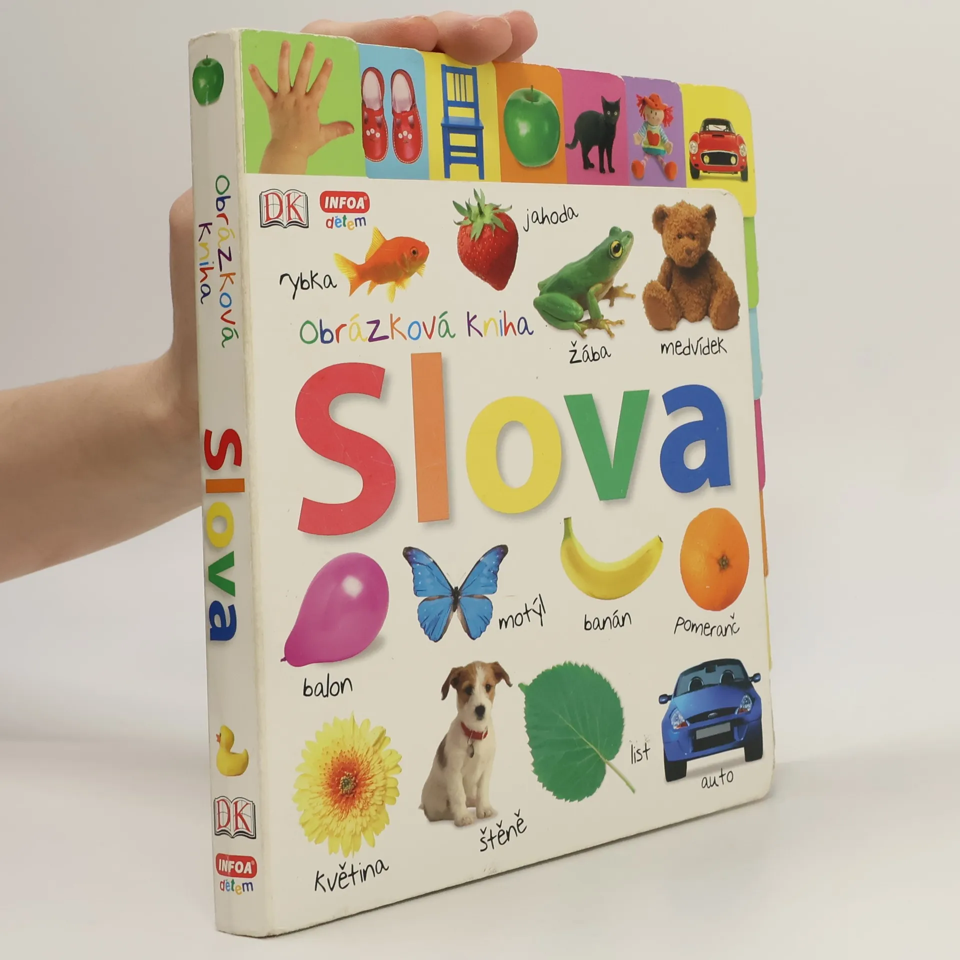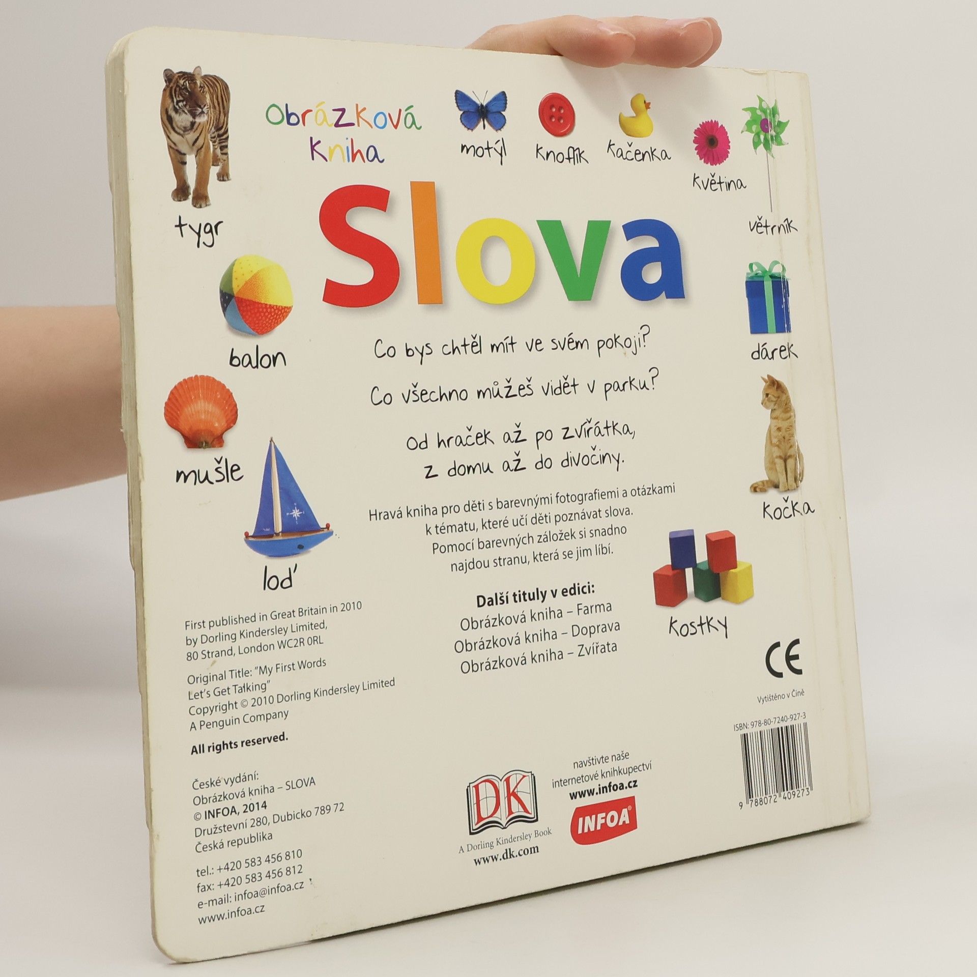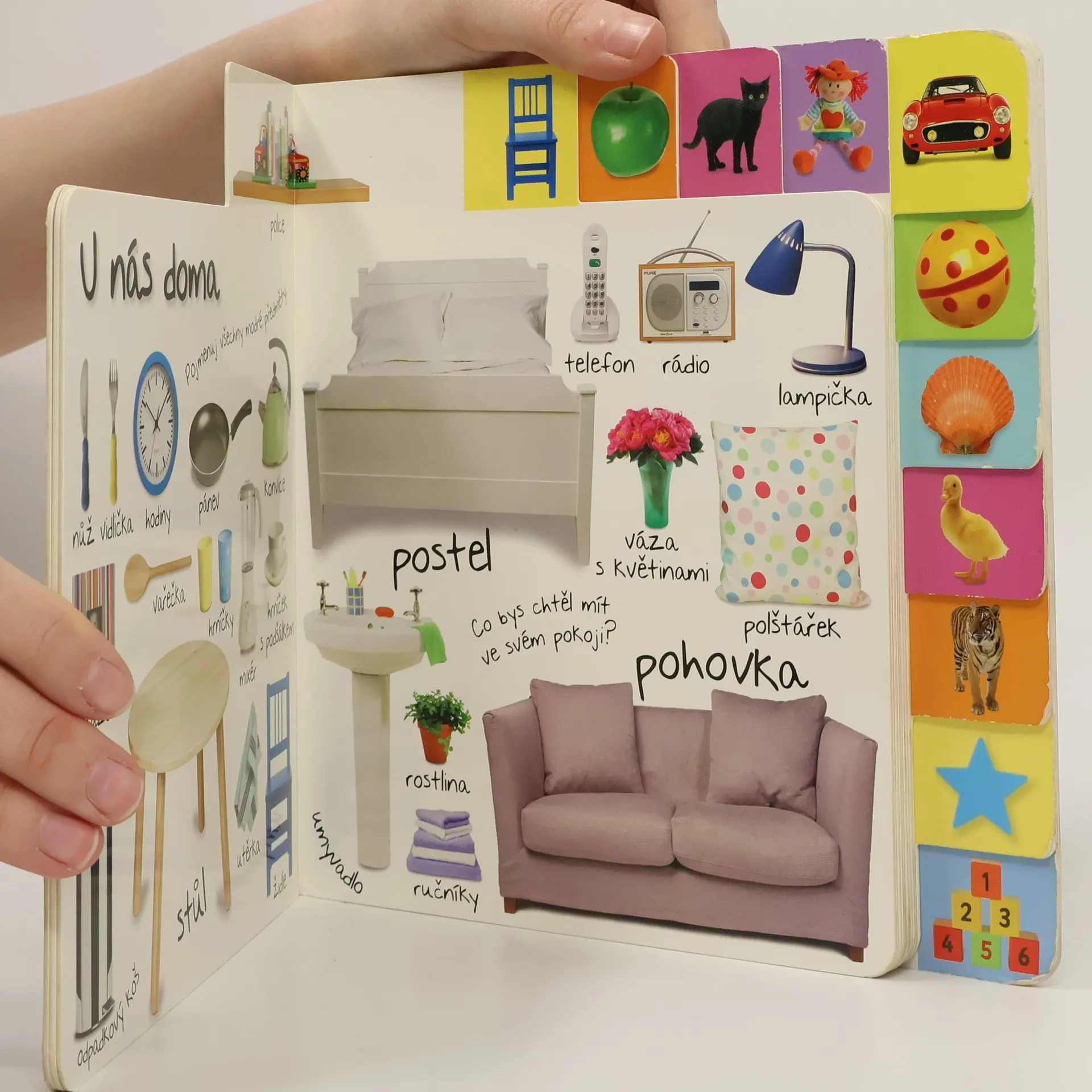 Hravá kniha pro děti s barevnými fotografiemi a otázkami k tématu, které učí děti poznávat slova. Pomocí barevných záložek si snadno najdou stranu, která se jim líbí.