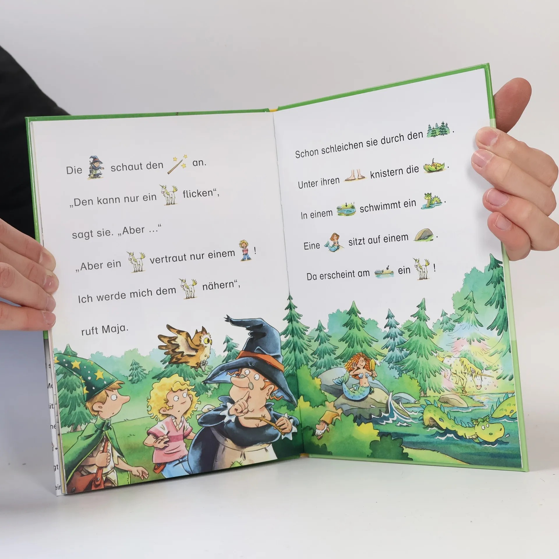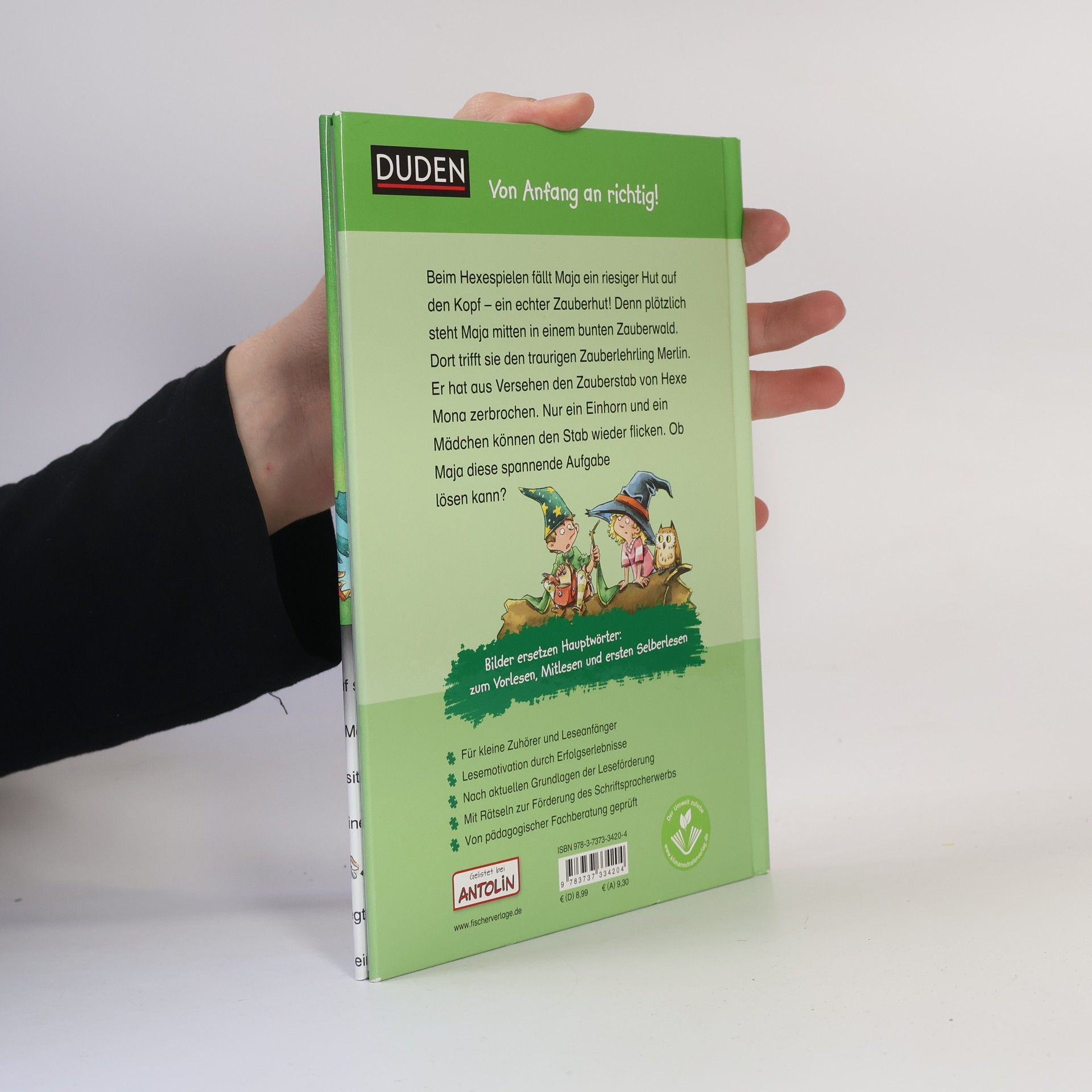 Mit Bildern lesen lernen: Lustiges Leselernbuch für die Vorschule ab 4 Jahren. Eindeutige Bilder ersetzen Hauptwörter, sodass Kinder ab 4 beim Vorlesen mitlesen können. In extragroßer Fibelschrift und kurzen, kindgerechten Sätzen wird eine magische Geschichte über Freundschaft und Fantasie erzählt, ideal zum Vorlesen oder ersten Selberlesen. Kleine, einfache Rätsel und wimmelige Suchseiten sorgen für jede Menge Lesespaß. Das Buch ist bei Antolin gelistet und von einer pädagogischen Fachberatung geprüft. Maja findet beim Hexespielen einen riesigen Hut, der sich als echter Zauberhut entpuppt. Plötzlich steht sie in einem bunten Zauberwald und trifft den verzweifelten Zauberlehrling Merlin, dessen Wetterzauber außer Kontrolle geraten ist, nachdem er den Zauberstab von Hexe Mona zerbrochen hat. Nur ein Einhorn und ein Mädchen können den Stab reparieren und den Zauber stoppen. Kann Maja diese spannende Aufgabe lösen? Das Buch ist das perfekte Geschenk zur Schulvorbereitung oder für die Schultüte. Lesen lernen mit Bildern ist ein effektives Prinzip, um Kinder im Vorschul- und Grundschulalter für Geschichten und das Lesen zu begeistern. Es fördert erste Kompetenzen spielerisch und bereitet Vorschulkinder gut auf den Schulstart vor. Duden – von Anfang an richtig! Lesenlernen leicht gemacht.