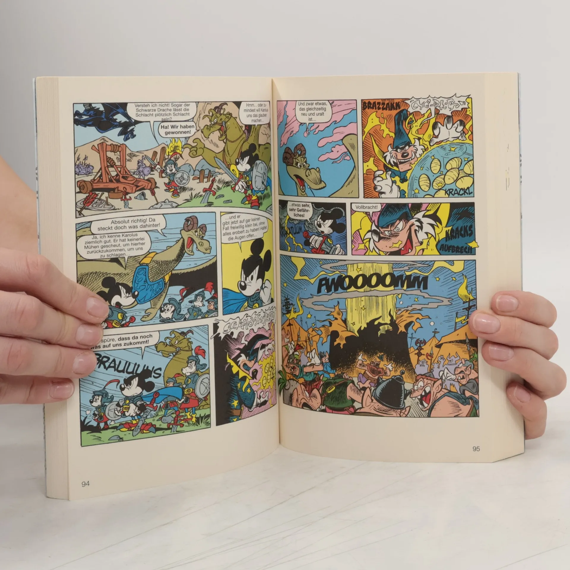 The German publication order and cover order differ from the Italian originals. This is why the numberings and covers do not match.Contains the following stories:- Die Drachenreiter- Der edle Ritter Franzelot - Flammender Opportunismus- Der Fluch des Drachen- Der edle Ritter Franzelot - Schläge- Der Haferschleim der Heiterkeit- Der Drache vom Ostental- Der edle Ritter Franzelot - Gut gerüstet?- Die Burgbaubrigade- Die feuerspeiende Prinzessin- Die Rüstung des Rostratos- Der edle Ritter Franzelot - Stillleben mit SchlemmerDer schreckliche Baron Karlo umwirbt die wunderschöne Prinzessin Minni, deren Herz jedoch dem Stallburschen Micky gehört. Bisher hat der Baron stets bekommen, was er wollte - und so soll es auch mit der anmutigen Prinzessin sein. Er macht sich auf zur Waldhexe, um sich von ihr einen Liebestrank brauen zu lassen. Doch auch Hexen sind nicht fehlerfrei. Minni hat sich nicht in Karlo verliebt, sondern spuckt auf einmal Feuer wie ein Drache. Um ihr zu helfen, macht sich Micky mit Goofy auf die Suche nach dem Magier Mog, der den Gegenzauber kennt. Doch dieser Weg ist nicht ganz ungefährlich.