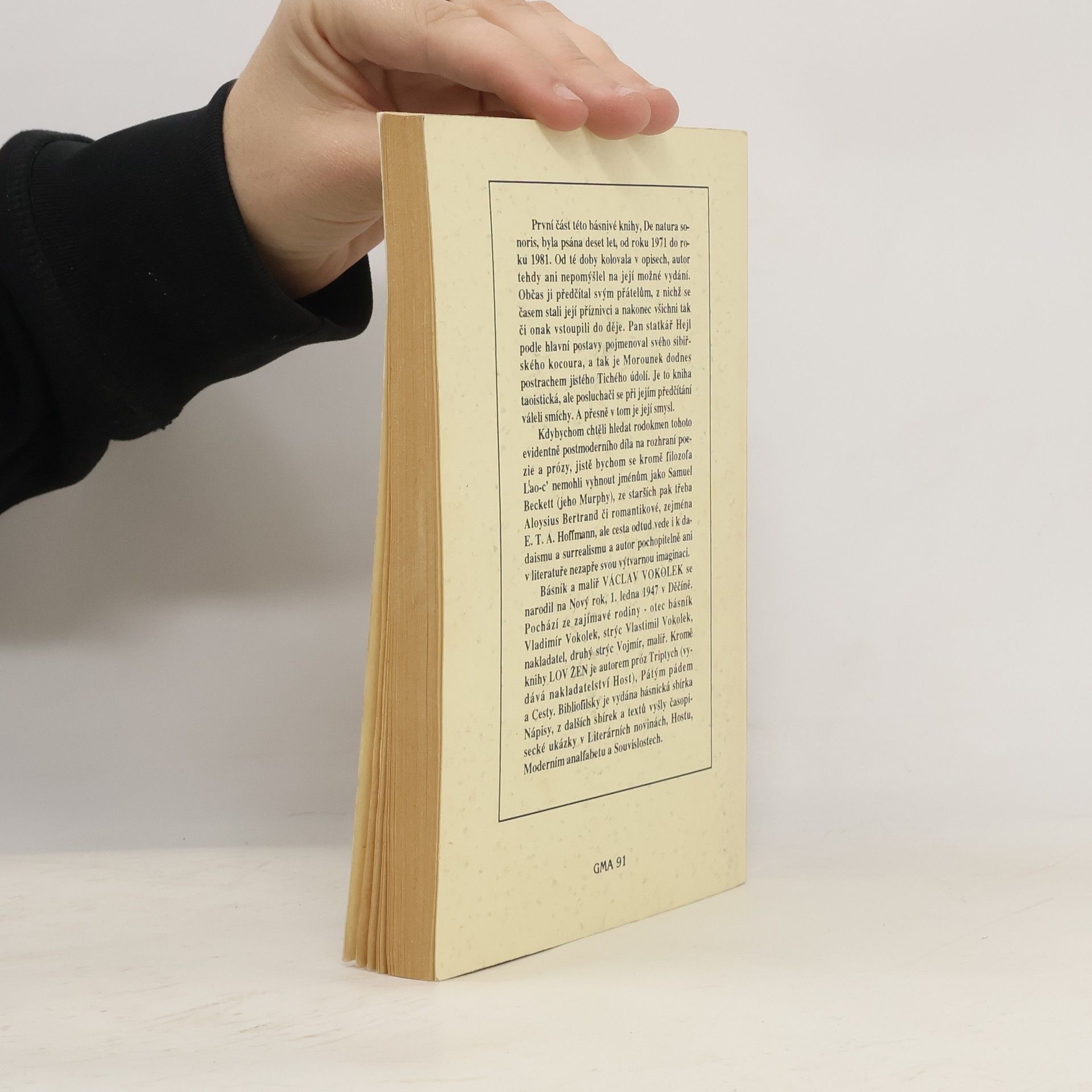 První část této básnivé knihy, De natura sonoris, byla psána deset let, od roku 1971 do roku 1981. Od té doby kolovala v opisech, autor tehdy ani nepomýšlel na její možné vydání. Občas ji předčítal svým přátelům, z nichž se časem stali její příznivci a nakonec všichni tak či onak vstoupili do děje. Pan statkář Hejl podle hlavní postavy pojmenoval svého sibiřského kocoura, a tak je Morounek dodnes postrachem jistého Tichého údolí. Je to kniha taoistická, ale posluchači se při jejím předčítání váleli smíchy. A přesně v tom je její smysl. Kdybychom chtěli hledat rodokmen tohoto evidentně postmoderního díla na rozhraní poezie a prózy, jistě bychom se kromě filozofa L'ao-c’ nemohli vyhnout jménům jako Samuel Beckett (jeho Murphy), ze starších pak třeba Aloysius Bertrand či romantikové, zejména E. T. A. Hoffmann, ale cesta odtud vede i k dadaismu a surrealismu a autor pochopitelně ani v literatuře nezapře svou výtvarnou imaginaci.