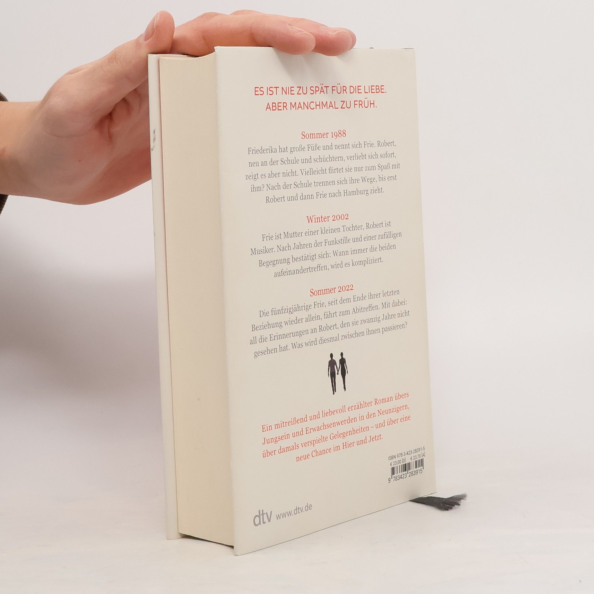 Es ist nie zu spät für die Liebe. Aber manchmal zu früh. Sommer 1988. Friederika hat große Füße und nennt sich Frie. Robert, neu an der Schule und schüchtern, verliebt sich sofort, aber zeigt es nicht. Vielleicht flirtet sie nur zum Spaß mit ihm? Winter 2002. Frie ist Mutter einer kleinen Tochter, Robert ist Musiker. Nach Jahren der Funkstille und einer zufälligen Begegnung bestätigt sich: Wann immer die beiden aufeinandertreffen, wird es kompliziert. Sommer 2022. Frie, inzwischen fünfzig und seit dem Ende ihrer letzten Beziehung wieder Single, fährt zum Abitreffen. Mit dabei: all die Erinnerungen an Robert, den sie seit einer halben Ewigkeit nicht gesehen hat. Was wird diesmal zwischen ihnen passieren? Ein mitreißend und liebevoll erzählter Roman übers Jungsein und Erwachsenwerden in den Neunzigern, über gelebte Träume und verpasste Gelegenheiten – und über eine neue Chance im Hier und Jetzt. Nach ihrem erfolgreichen Debüt ›Am liebsten sitzen alle in der Küche‹ – der neue, eindringliche und sympathisch ehrliche Roman von Julia Karnick. Eine mit Feingefühl und Humor erzählte Geschichte über eine große Liebe und falsche Momente.