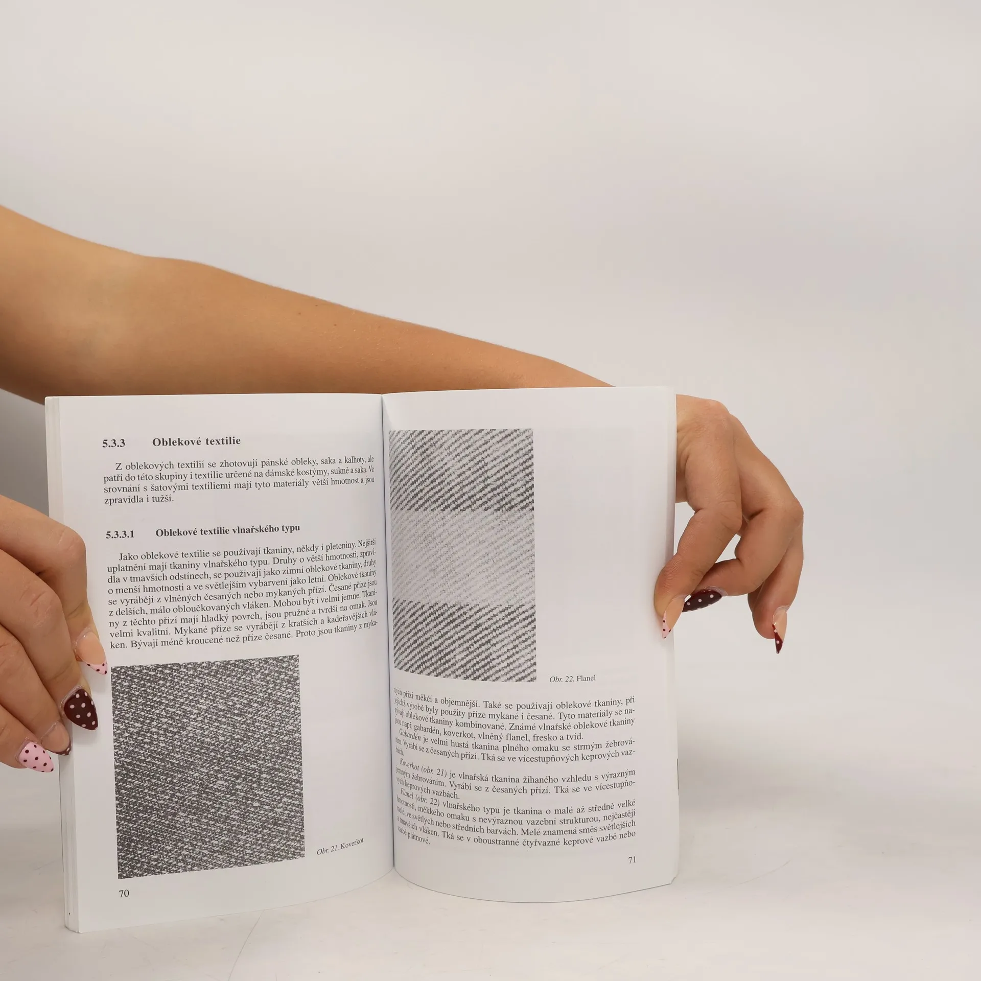 Kniha je druhé, přepracované vydání. Na fotografii zobrazen i první díl. Učebnice pojednává o netkaných, vrstvených a laminátových textiliích. Dále popisuje zušlechťování, oděvní textilie a drobnou přípravu a uvádí rozbory a zkoušení textilií.
