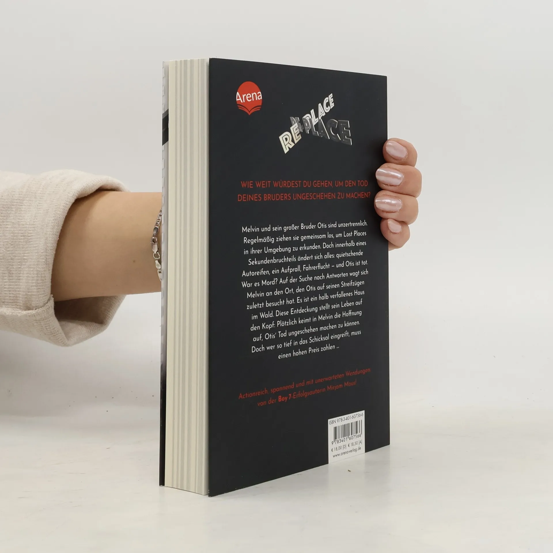 Fesselnder und vielschichtiger Spannungsroman voller spekulativer Fragen und menschlicher Konflikte für Thriller-Fans ab 12. Melvin und sein großer Bruder Otis sind unzertrennlich. Regelmäßig ziehen sie gemeinsam los, um Lost Places in ihrer Umgebung zu erkunden. Doch innerhalb eines Sekundenbruchteils ändert sich alles: Quietschende Autoreifen, ein Aufprall, Fahrerflucht ? Otis ist tot. Aber wer ist sein Mörder? Auf der Suche nach Antworten wagt sich Melvin an den Ort, den Otis auf seinen Streifzügen zuletzt entdeckt hat, ein halb verfallenes Haus im Wald. Was er hier findet, verändert für immer sein Verständnis von Zeit und Raum. Und es weckt in ihm die waghalsige Hoffnung, Otis’ Tod ungeschehen machen zu können. Doch wer so tief in das Schicksal eingreift, muss einen hohen Preis zahlen. Kurze Kapitel, rasante Dialoge, abwechslungsreiches Layout sowie zahlreiche Wendungen und Cliffhanger machen Re-Place zum Thriller-Genuss der Extraklasse. Alle, die Boy 7 nicht aus der Hand legen konnten, kommen auch im neuen Roman von Erfolgs-Autorin Mirjam Mous voll auf ihre Kosten.