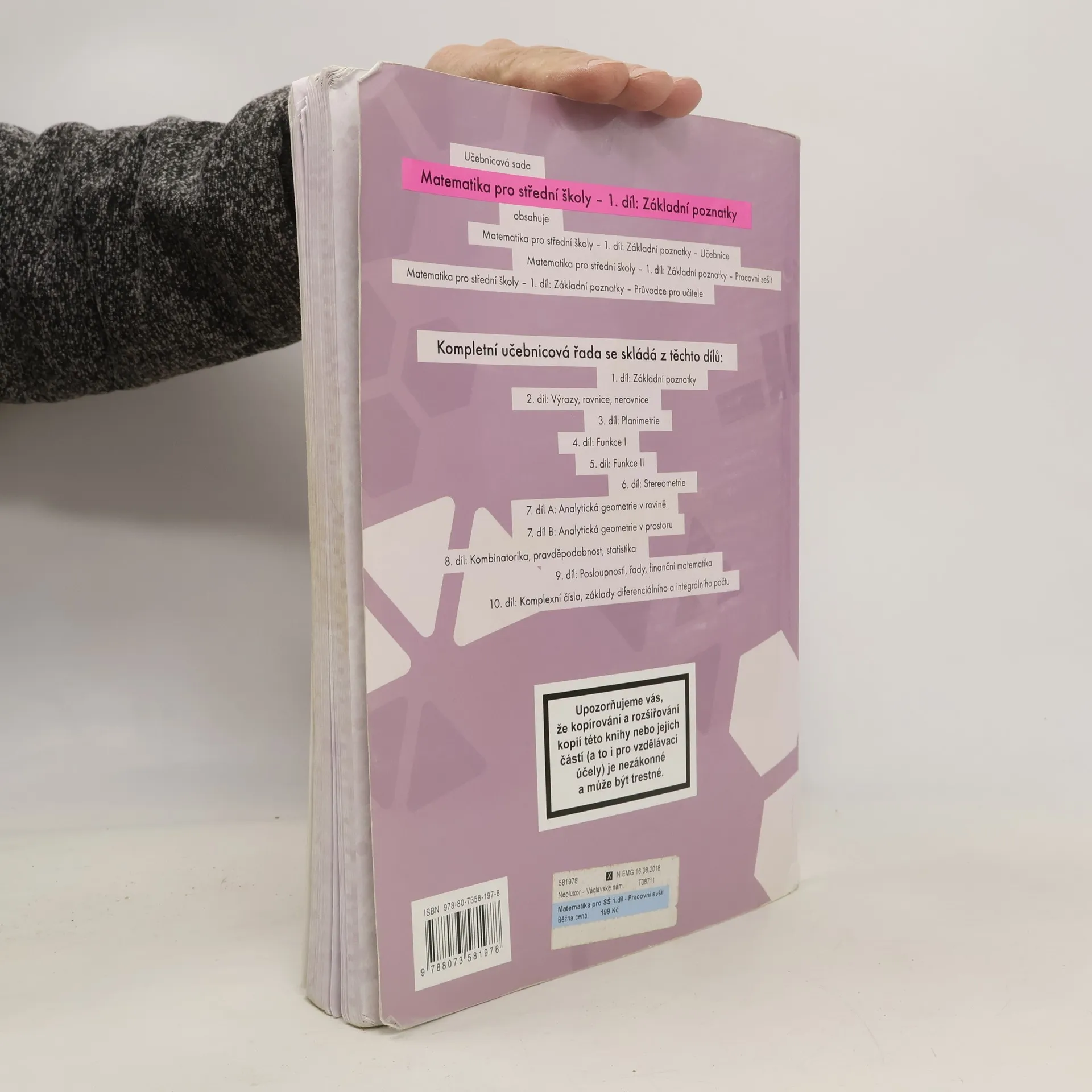 Přehledně, moderně a pro studenty přístupně zpracovaná učebnice vnáší nové možnosti do výuky matematiky na středních školách. Obsah první části zahrnuje základní poznatky o číselných oborech, výrokové logice a teorii množin. Učivo je srozumitelně a strukturovaně podáno ve výkladové části učebnice a je doplněno jednoduchými řešenými příklady.