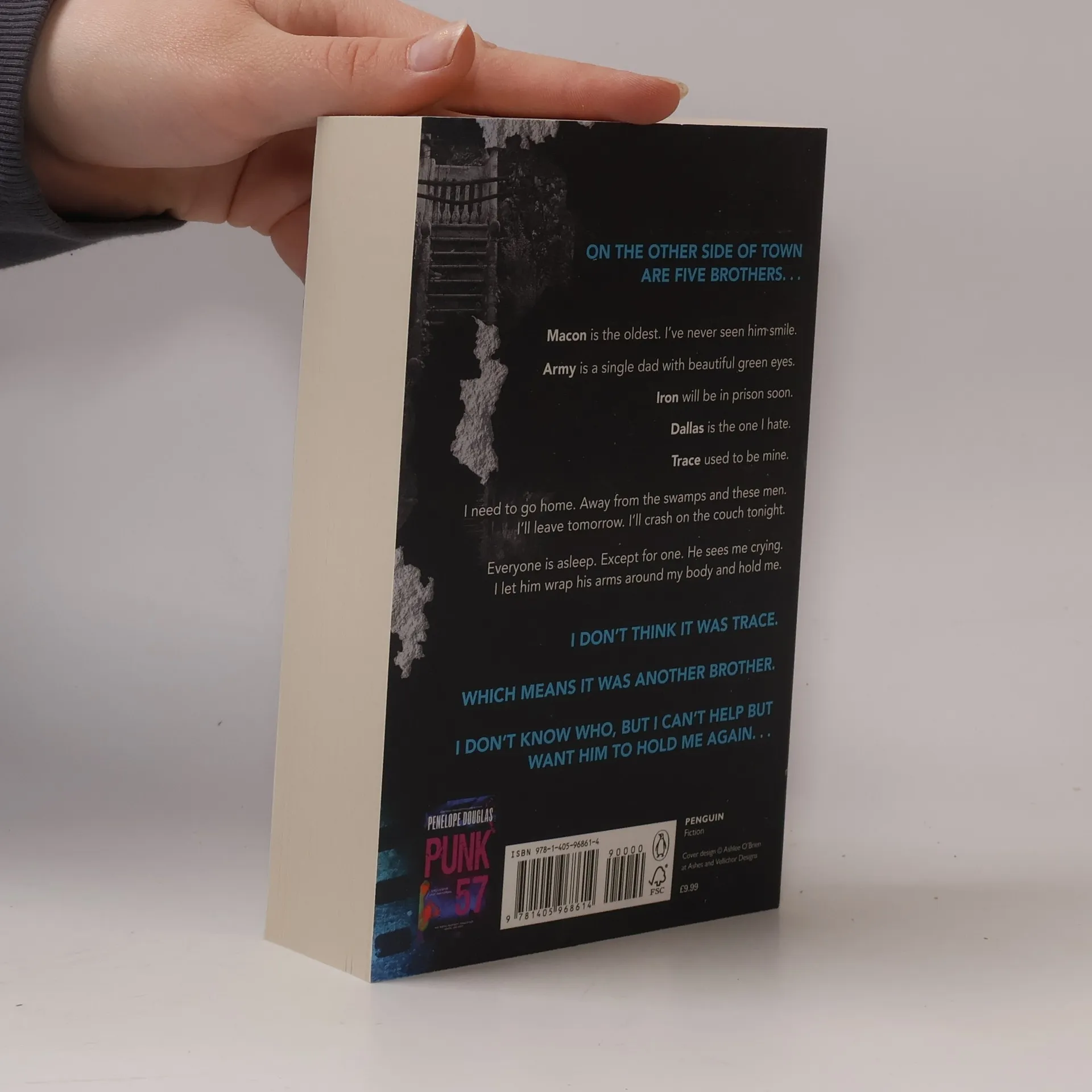 On the other side of town are five brothers. . . Macon is the oldest. I've never seen him smile. Army is a single dad with beautiful green eyes. Iron will be in prison soon. Dallas is the one I hate. Trace used to be mine. I need to go home. Away from the swamps and these men. I'll leave tomorrow. Tonight I'll crash on the couch tonight. Everyone is asleep. Except for one. He sees me crying. I let him wrap his arms around my body and hold me. I don't think it was Trace. Which means it was another brother. I don't know who, but I can't help but want him to hold me again. . .