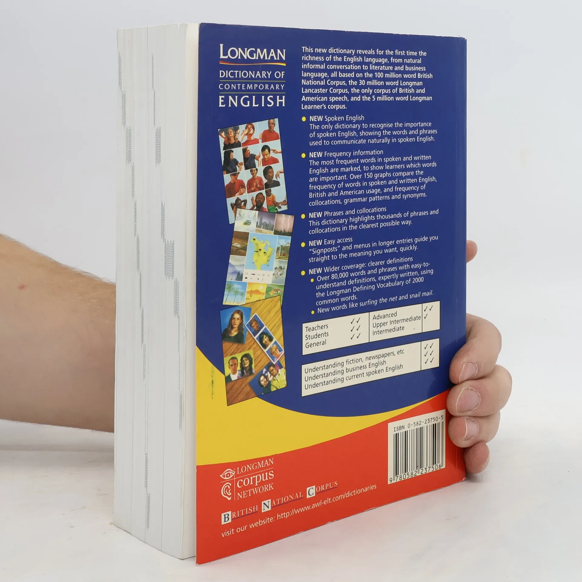 Based on the 100-million word British National Corpus and the Longman Corpus Network, this dictionary explores a vivid and exciting area of English - spoken English. It also pinpoints the language patterns and grammar unique to spoken English. The 2000-word Longman Defining Vocabulary is made up of words students already know, and the dictionary's definitions have been written using this familiar set of core words.