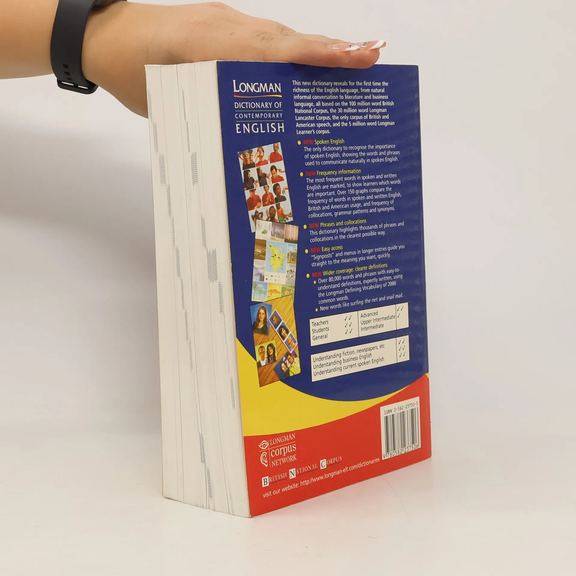 Based on the 100-million word British National Corpus and the Longman Corpus Network, this dictionary explores a vivid and exciting area of English - spoken English. It also pinpoints the language patterns and grammar unique to spoken English. The 2000-word Longman Defining Vocabulary is made up of words students already know, and the dictionary's definitions have been written using this familiar set of core words.