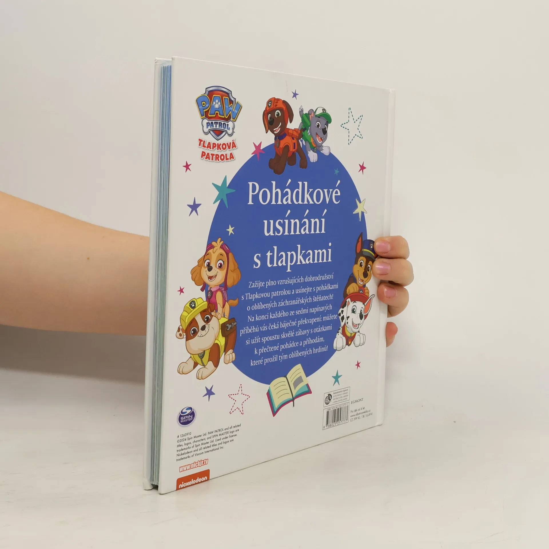Chcete před spaním zažít parádní dobrodružství s Tlapkovou patrolou? Tak honem do postýlky s pohádkou! Tým odvážných hrdinů bude tentokrát zachraňovat chobotničku v nesnázích, zúčastní se napínavého závodu v Adventure Bay, vyzkouší si bojová umění, a když si Chase zlomí zoubek, navštíví i zubařskou ordinaci. Štěňata vyrážejí do akce, aby podala pomocnou tlapku kamarádům v nouzi. Na konci každého ze sedmi příběhů vás navíc čeká báječné překvapení: můžete si užít spoustu zábavy s otázkami k přečtené pohádce.