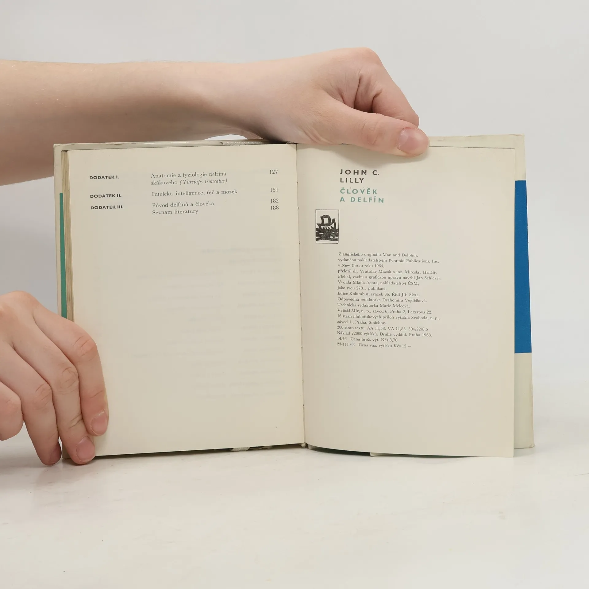 2. vydání tehdy populární knihy o komunikaci mezi lidmi a vodním stvořením – delfínem. Dnes padesátiletý americký vědec, neurolog a neurofyziolog, předkládá ve své knížce zajímavé výsledky badatelské práce, jejímž předmětem byl výzkum života delfínů. Jeho poznatky získané dlouhodobým pozorováním a stykem s delfíny i nesčetnými pokusy dokazují vysokou inteligenci těchto zvířat a otvírají cestu dalším výzkumům o možnostech dorozumění člověka s jinými živočišnými druhy.