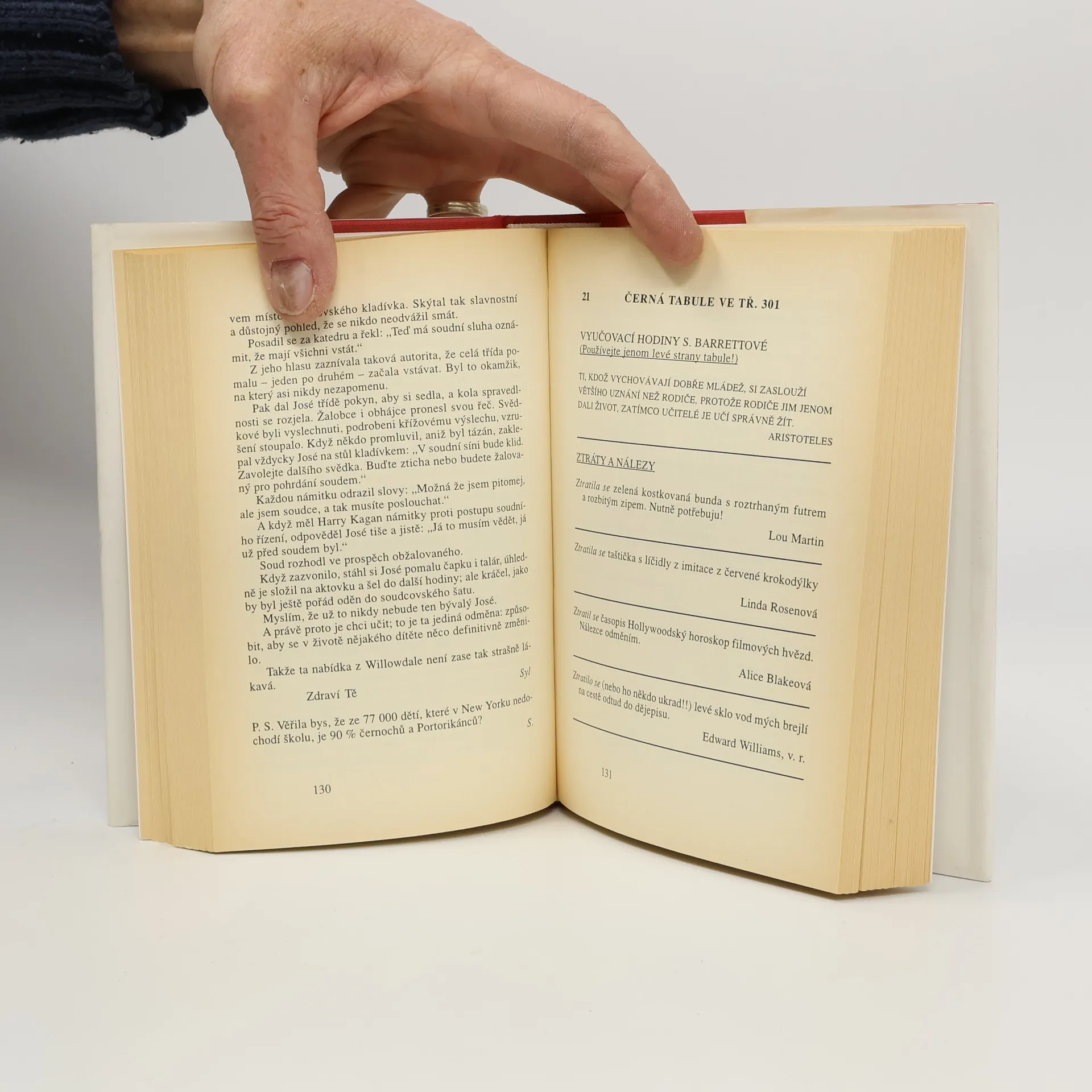 Humoristický román zachycuje poměry na newyorské střední škole, kam chodí děti černochů, přistěhovalců a různé problémové případy. Svérázné pojetí demokracie ve vztahu učitele a žáka, snaha vedení školy řídit výuku pomocí výnosů a oběžníků, propast mezi představami a skutečností - to vše vede k řadě komických i vážných situací, které autorka zachytila s neodolatelným humorem. Výroky žáků, jejich úkoly a dopisy se v pestrém sledu střídají s oběžníky a s příkazy i se vzájemnou korespondencí vedení a učitelů a to vše vytváří velmi autentický a působivý celek.