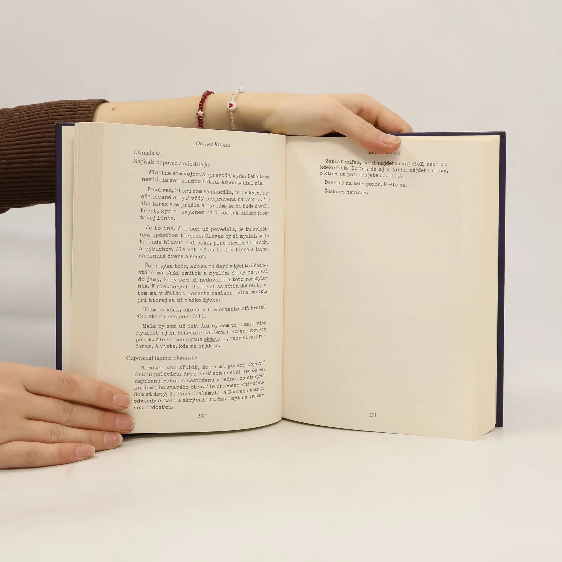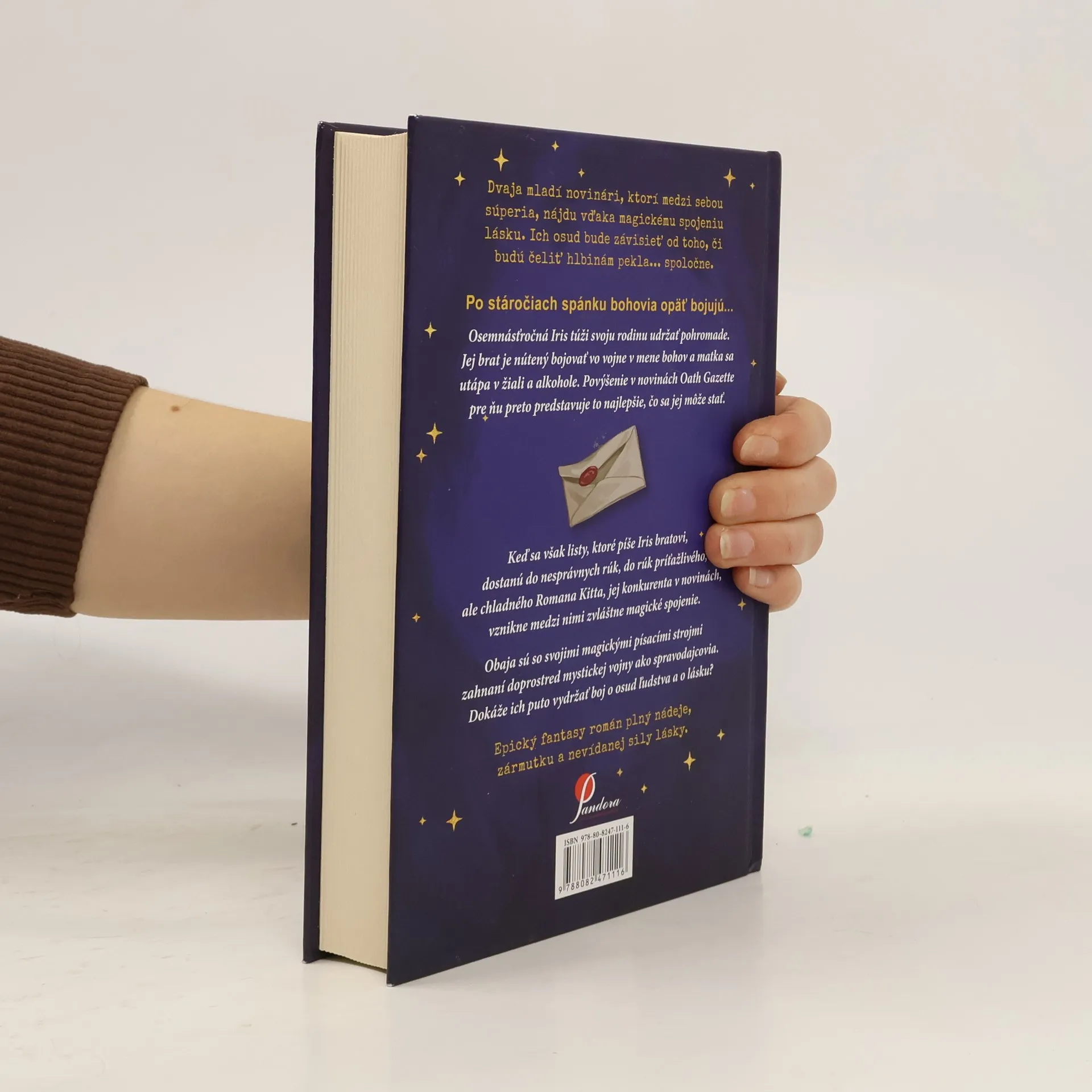 NIJAKÝ BOH, NIJAKÁ VOJNA, NIKTO, SA NEMÔŽE POSTAVIŤ MEDZI NICH. Dvaja mladí novinári, ktorí medzi sebou súperia, nájdu vďaka magickému spojeniu lásku. Ich osud bude závisieť od toho, či budú čeliť hlbinám pekla... spoločne. Po stáročiach spánku bohovia opäť bojujú... Osemnásťročná Iris túži svoju rodinu udržať pohromade. Jej brat je nútený bojovať vo vojne v mene bohov a matka sa utápa v žiali a alkohole. Povýšenie v novinách Oath Gazette pre ňu preto predstavuje to najlepšie, čo sa jej môže stať. Keď sa však listy, ktoré píše Iris bratovi, dostanú do nesprávnych rúk, do rúk príťažlivého, ale chladného Romana Kitta, jej konkurenta v novinách, vznikne medzi nimi zvláštne magické spojenie. Obaja sú so svojimi magickými písacími strojmi zahnaní doprostred mystickej vojny ako spravodajcovia. Dokáže ich puto vydržať boj o osud ľudstva a o lásku? Epický fantasy román plný nádeje, zármutku a nevídanej sily lásky.