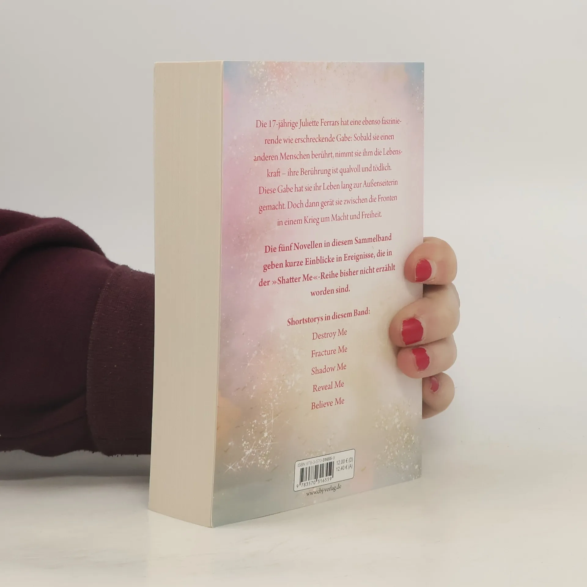 Was bisher unerzählt blieb ... Die 17-jährige Juliette Ferrars hat eine ebenso faszinierende wie erschreckende Gabe: Sobald sie einen anderen Menschen berührt, nimmt sie ihm die Lebenskraft – ihre Berührung ist qualvoll und tödlich. Diese Gabe hat sie ihr Leben lang zur Außenseiterin gemacht. Doch dann gerät sie zwischen die Fronten in einem Krieg um Macht und Freiheit. Die fünf Kurzgeschichten in diesem Sammelband geben kurze Einblicke in Ereignisse, die in der »Shatter Me«-Reihe bisher nicht erzählt worden sind. Warner, Adam und Kenji erzählen aus ihrer Sicht, wie sie Schlüsselmomente der Abenteuer erlebt haben. Für alle, die von Juliette und Warner nicht genug bekommen können: Die Novellen zu der TikTok Sensation Shortstories in diesem Band: Destroy Me (Band 1.5) Fracture Me (Band 2.5) Shadow Me (Band 4.5) Reveal Me (Band 5.5) Believe Me (Band 6.5)