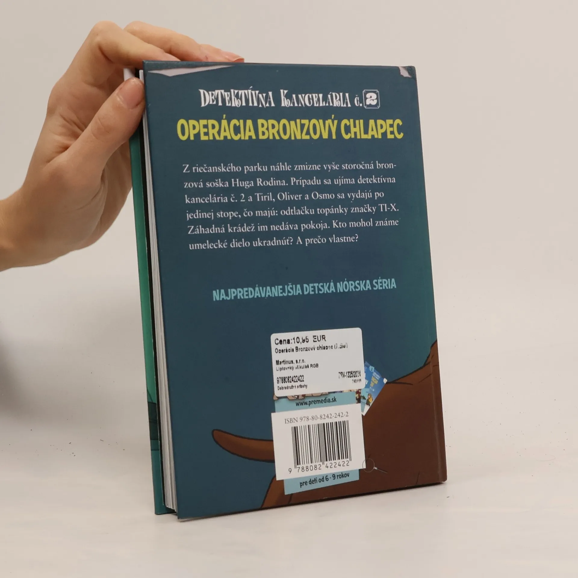 Z riečanského parku náhle zmizne vyše storočná bronzová soška Huga Rodina. Prípadu sa ujíma detektívna kancelária č. 2 a Tiril, Oliver a Osmo sa vydajú po jedinej stope, čo majú: odtlačku topánky známej značky. Záhadná krádež im nedáva pokoja. Kto mohol umelecké dielo ukradnúť? A prečo vlastne? Oliver, Tiril a ich verný pes Osmo riešia siedmy prípad svojej detektívnej kancelárie. V súčasnosti najpopulárnejšia nórska séria pre deti má už viac ako dvadsať dielov a každý z nich rieši záhadu, ktorá dá zabrať aj dospelým.