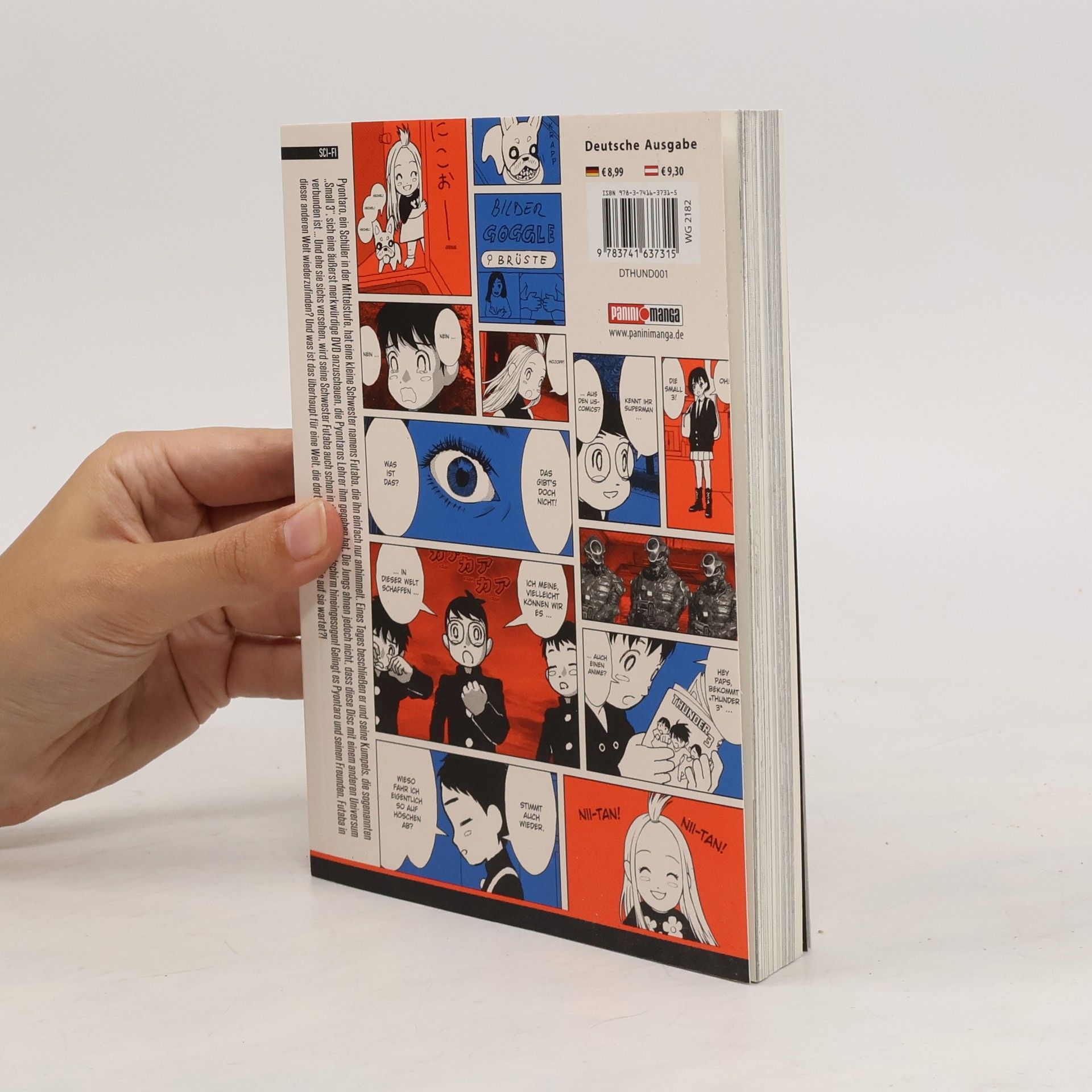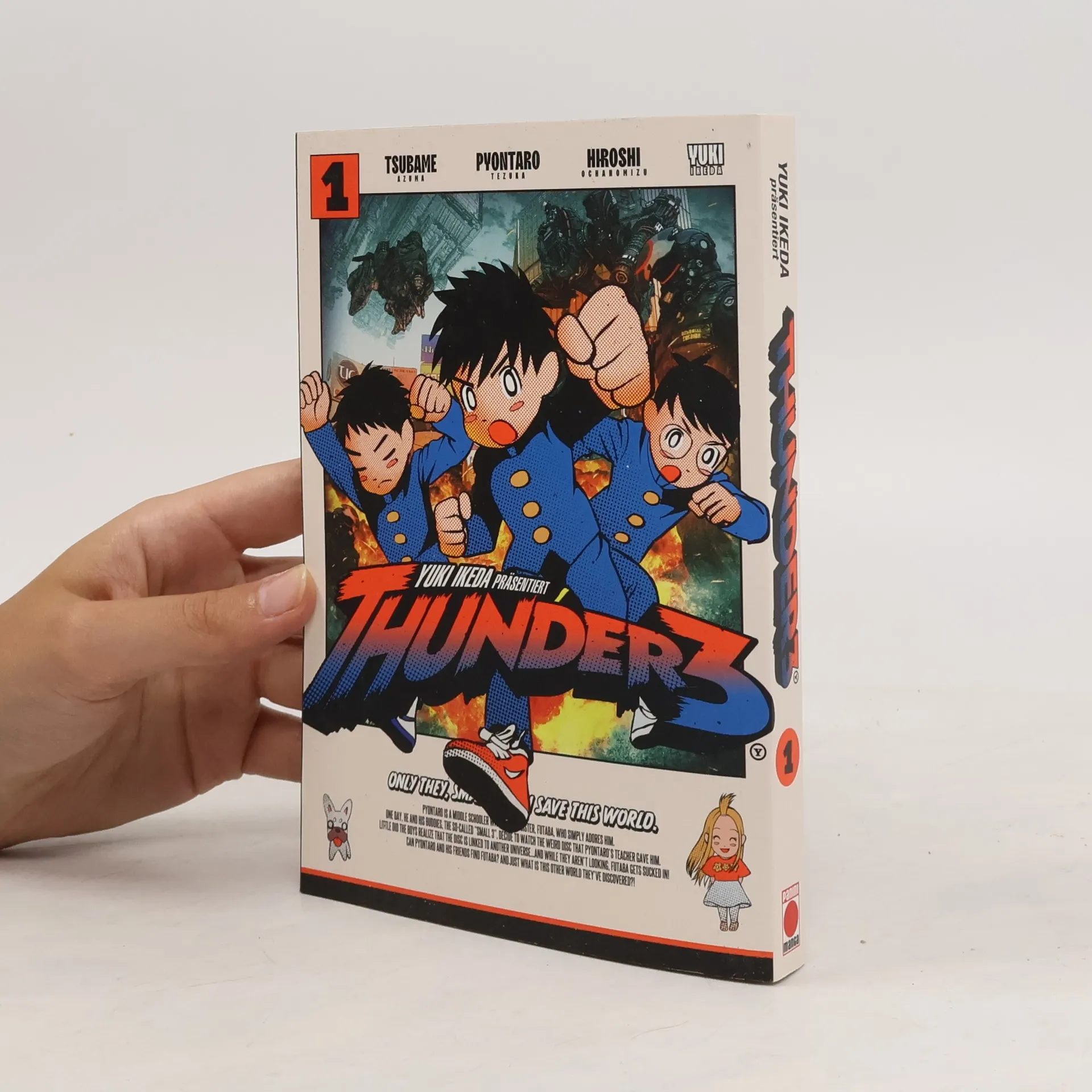 THUNDER 3 – Das ultimative Manga-Abenteuer im Multiversum! Begleite drei Freunde, die aus einem klassischen Gag-Manga im Retro-Look in eine hyperrealistische Sci-Fi-Welt im Gantz-Stil springen, um die kleine Schwester von einem der Jungen zu retten. Auf ihrem Abenteuer werden sie allerdings nicht nur mit gefährlichen Gegnern, skurrilen Situationen und überraschenden Wendungen konfrontiert … Das erwartet dich in Band 1: Pyontaro, ein Schüler in der Mittelstufe, hat eine kleine Schwester namens Futaba, die ihn einfach nur anhimmelt. Die Jungs ahnen jedoch nicht, dass diese Disc mit einem anderen Universum verbunden ist … Und ehe sie sichs versehen, wird seine Schwester Futaba auch schon in den Fernsehbildschirm hineingesogen! Gelingt es Pyontaro und seinen Freunden, Futaba in dieser anderen Welt wiederzufinden? Und was ist das überhaupt für eine Welt, die dort auf der anderen Seite auf sie wartet?! Für Fans von Action-, Abenteuer- und Sci-Fi-Manga! 1. Auflage mit SNS Card und Sammelpostkarte!