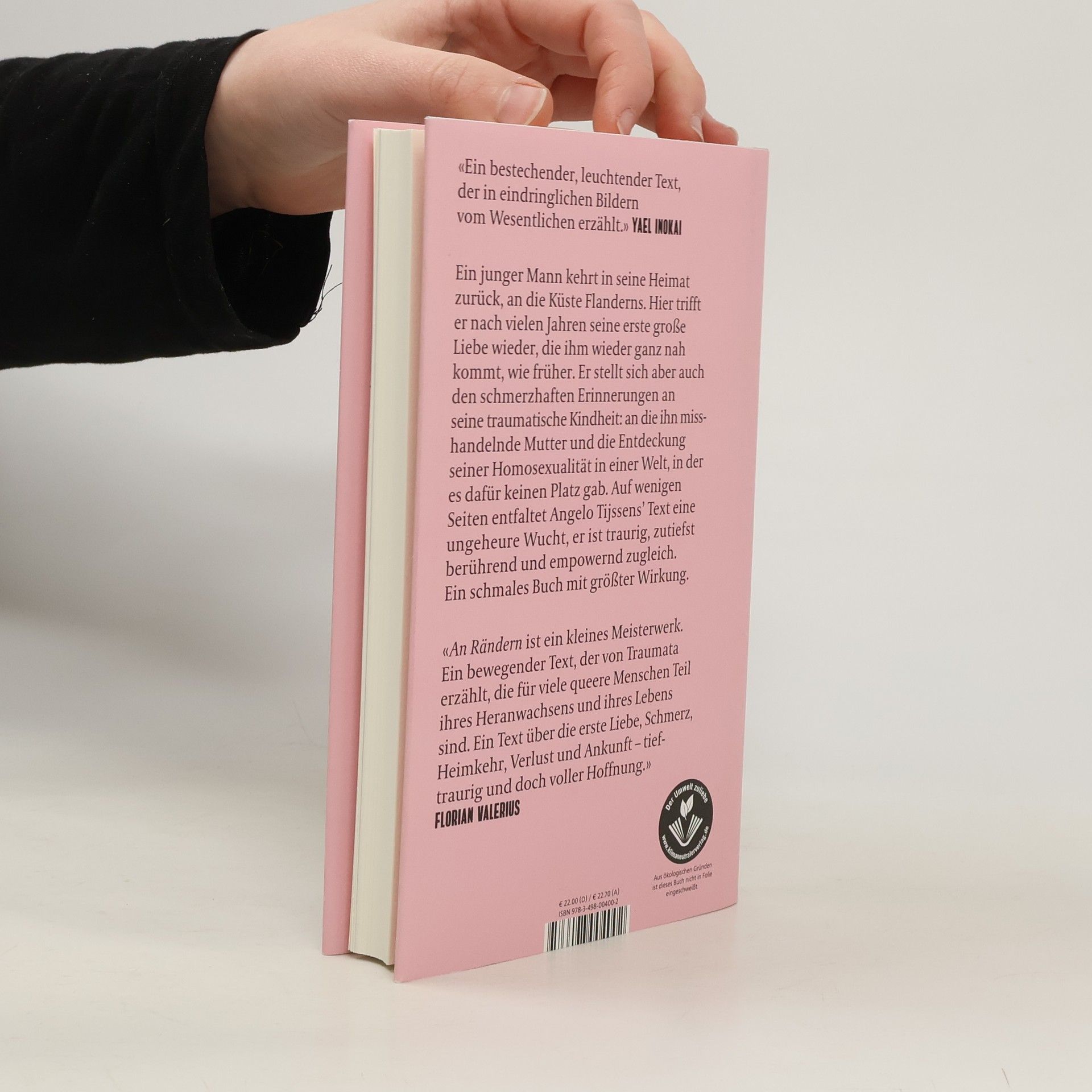 Nachdem Angelo Tijssens Kritiker:innen und Zuschauer:innen auf der ganzen Welt mit seinem Film Close begeistert hat, legt der flämische Drehbuchautor nun sein kunstvoll erzähltes, außerordentlich berührendes Romandebüt vor. Wie überlebt man die größte Einsamkeit, den tiefsten Schmerz? Und wie wird aus erfahrener Ablehnung mutige Selbstbehauptung? Ein junger Mann kehrt nach dem Tod der Mutter in seine Heimat, an die Küste Flanderns zurück. Hier trifft er nach vielen Jahren seine erste große Liebe wieder, die ihm nach wie vor Nähe und Zuflucht spendet. Er stellt sich aber auch den schmerzhaften Erinnerungen an seine traumatische Kindheit. Es sind Reminiszenzen an seine ihn misshandelnde Mutter und die Entdeckung seiner Homosexualität in einer Welt, in der es dafür keinen Platz gab. Seine Reise verbindet Liebesgeschichte, Abschied von der Vergangenheit und hoffnungsvollen Neubeginn auf eindrucksvolle Weise.An Rändern ist ein schmaler Roman mit größter Wirkung: Auf wenigen Seiten entfaltet er eine ungeheure Wucht, ist verstörend und herzerwärmend, traurig und unglaublich empowernd zugleich. Ein Text mit Nachhall.