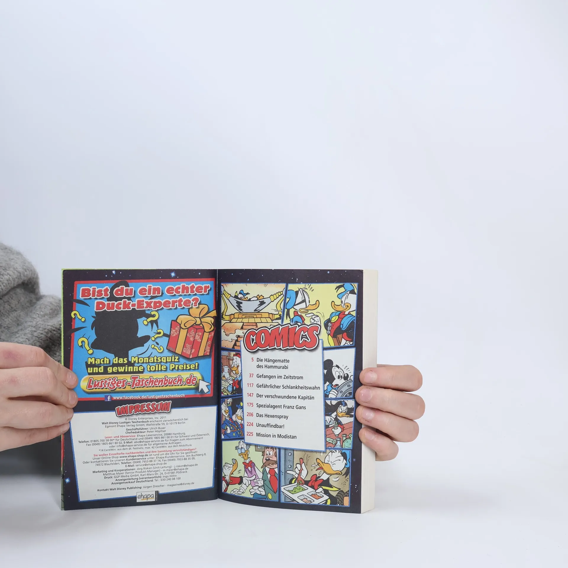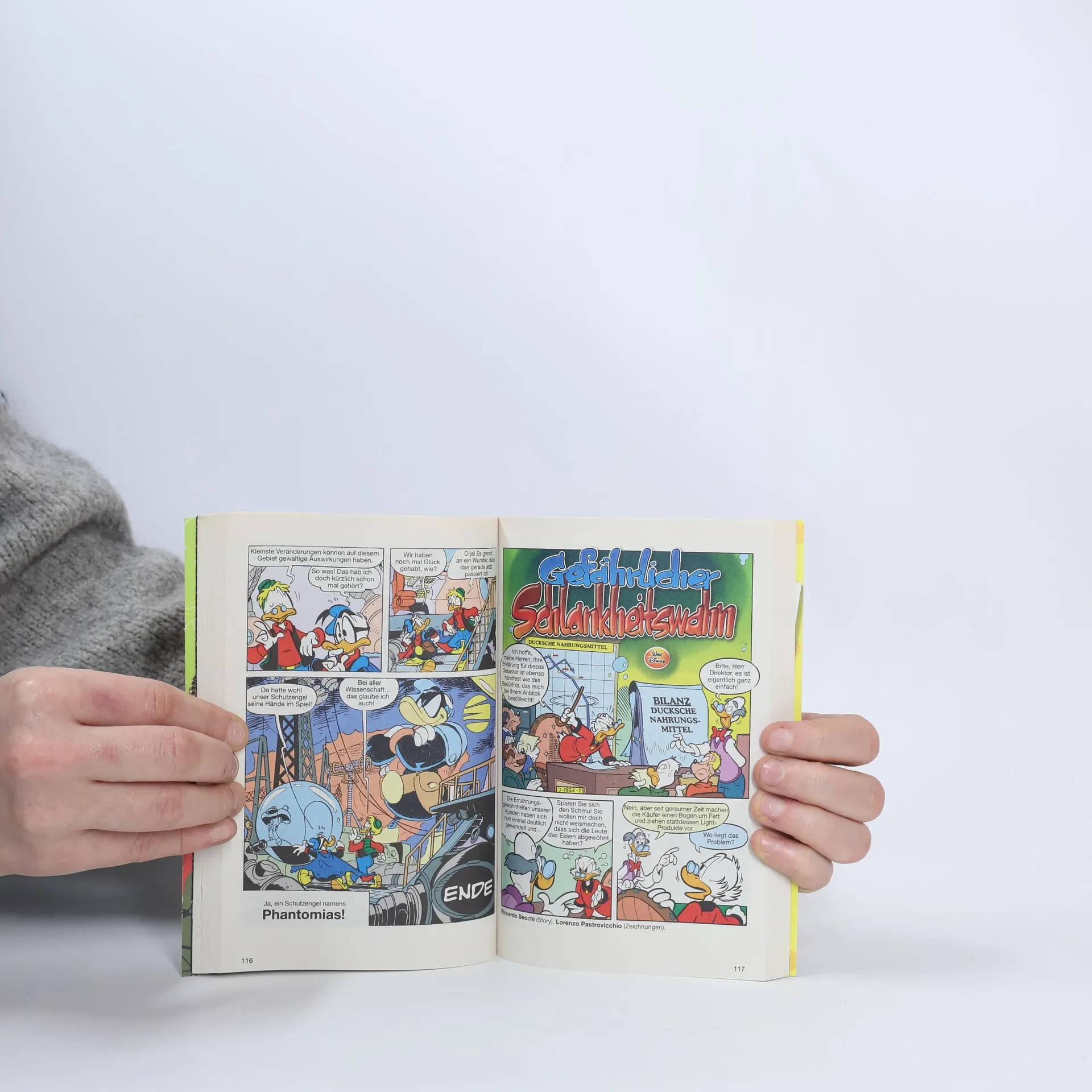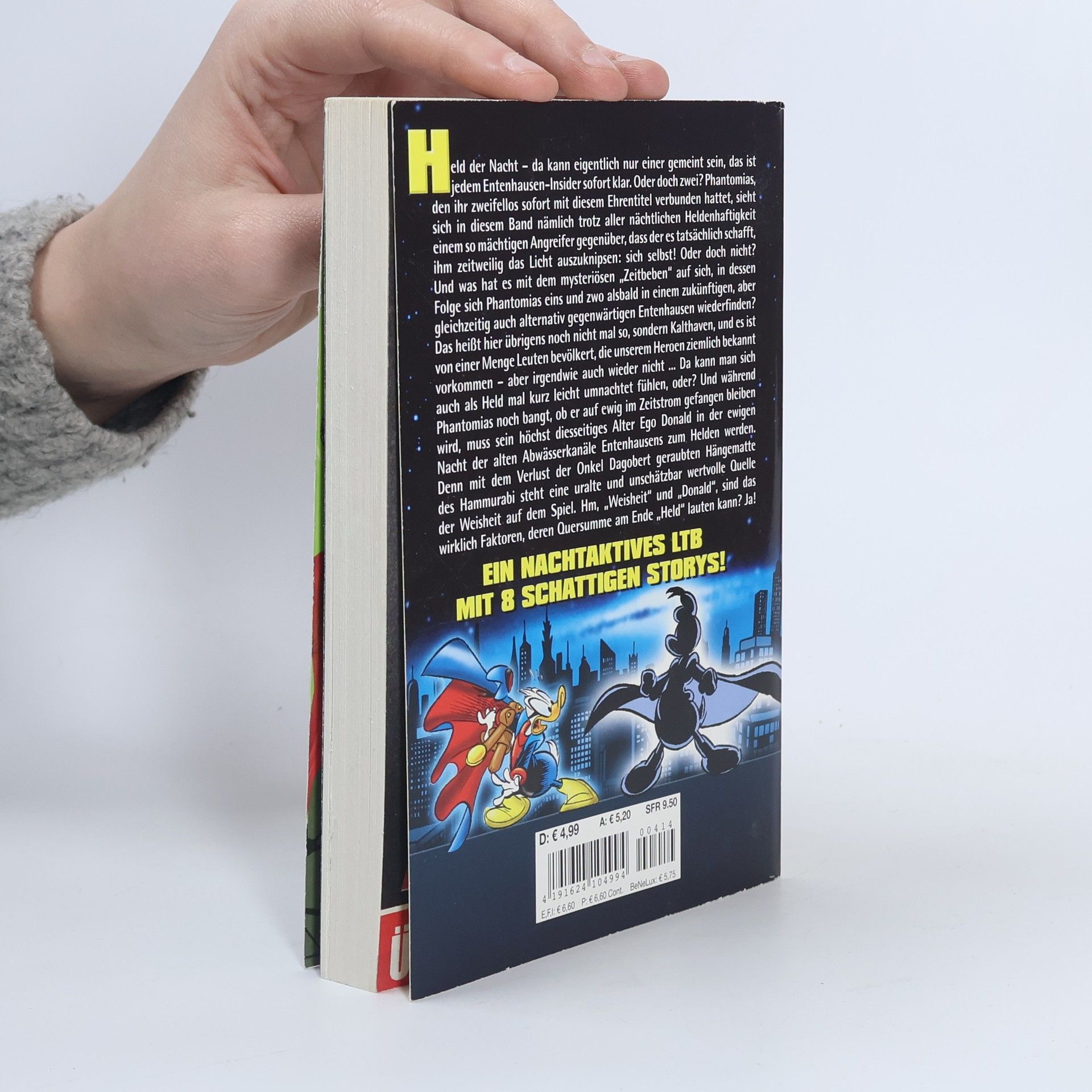 Held der Nacht – da kann eigentlich nur einer gemeint sein, das ist jedem Entenhausen-Insider sofort klar. Oder doch zwei? Phantomias, den ihr zweifellos sofort mit diesem Ehrentitel verbunden hattet, sieht sich in diesem Band nämlich trotz aller nächtlichen Heldenhaftigkeit einem so mächtigen Angreifer gegenüber, dass der es tatsächlich schafft, ihm zeitweilig das Licht auszuknipsen: sich selbst! Oder doch nicht? Und was hat es mit dem mysteriösen „Zeitbeben“ auf sich, in dessen Folge sich Phantomias eins und zwo alsbald in einem zukünftigen, aber gleichzeitig auch alternativ gegenwärtigen Entenhausen wiederfi nden? Das heißt hier übrigens noch nicht mal so, sondern Kalthaven, und es ist von einer Menge Leuten bevölkert, die unserem Heroen ziemlich bekannt vorkommen – aber irgendwie auch wieder nicht ... Da kann man sich auch als Held mal kurz leicht umnachtet fühlen, oder? Und während Phantomias noch bangt, ob er auf ewig im Zeitstrom gefangen bleiben wird, muss sein höchst diesseitiges Alter Ego Donald in der ewigen Nacht der alten Abwässerkanäle Entenhausens zum Helden werden. Denn mit dem Verlust der Onkel Dagobert geraubten Hängematte des Hammurabi steht eine uralte und unschätzbar wertvolle Quelle der Weisheit auf dem Spiel. Hm, „Weisheit“ und „Donald“, sind das wirklich Faktoren, deren Quersumme am Ende „Held“ lauten kann? Ja!EIN NACHTAKTIVES LTB MIT 8 SCHATTIGEN STORYS!